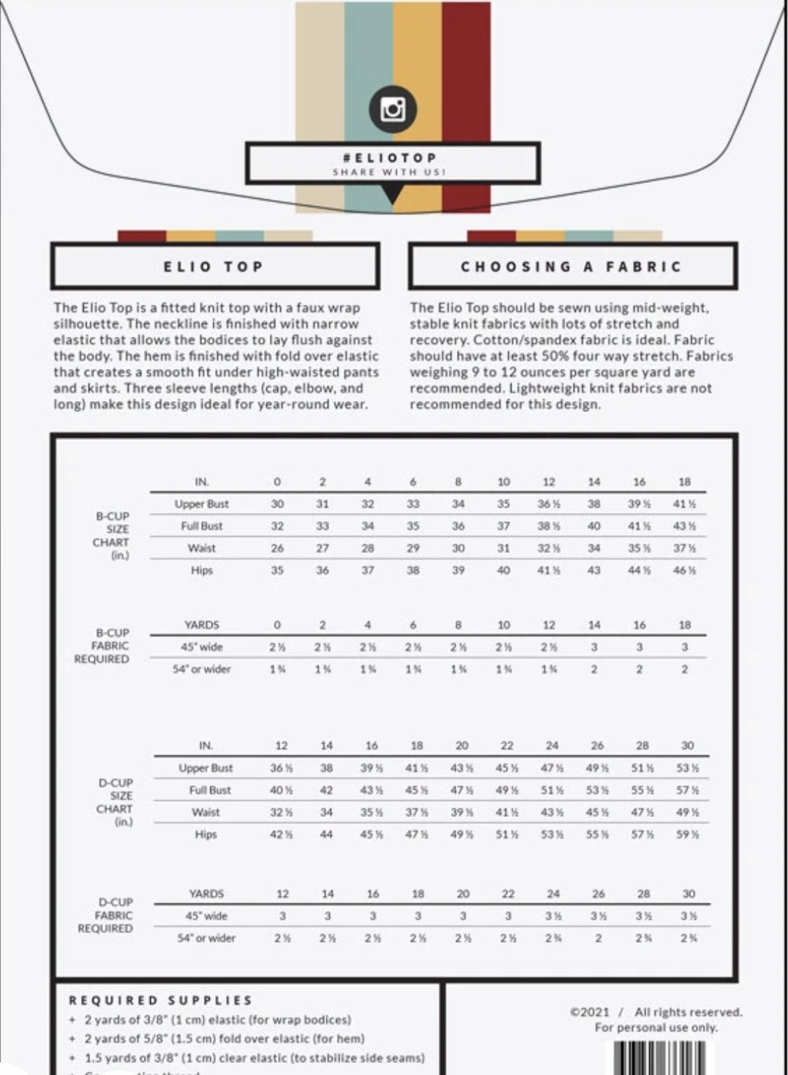 The Allie Olson - Elio Top Print Pattern is a chic and versatile sewing pattern designed for fitted knit tops with a flattering faux wrap silhouette. Perfect for layering or wearing on its own, the Elio Top features a sleek elastic-finished neckline, a smooth fold-over elastic hem, and three sleeve lengths—cap, elbow, and long—for year-round wear. Designed for stable knit fabrics with excellent stretch and recovery, this pattern is ideal for creating a stylish wardrobe staple that pairs beautifully with high-waisted pants and skirts.