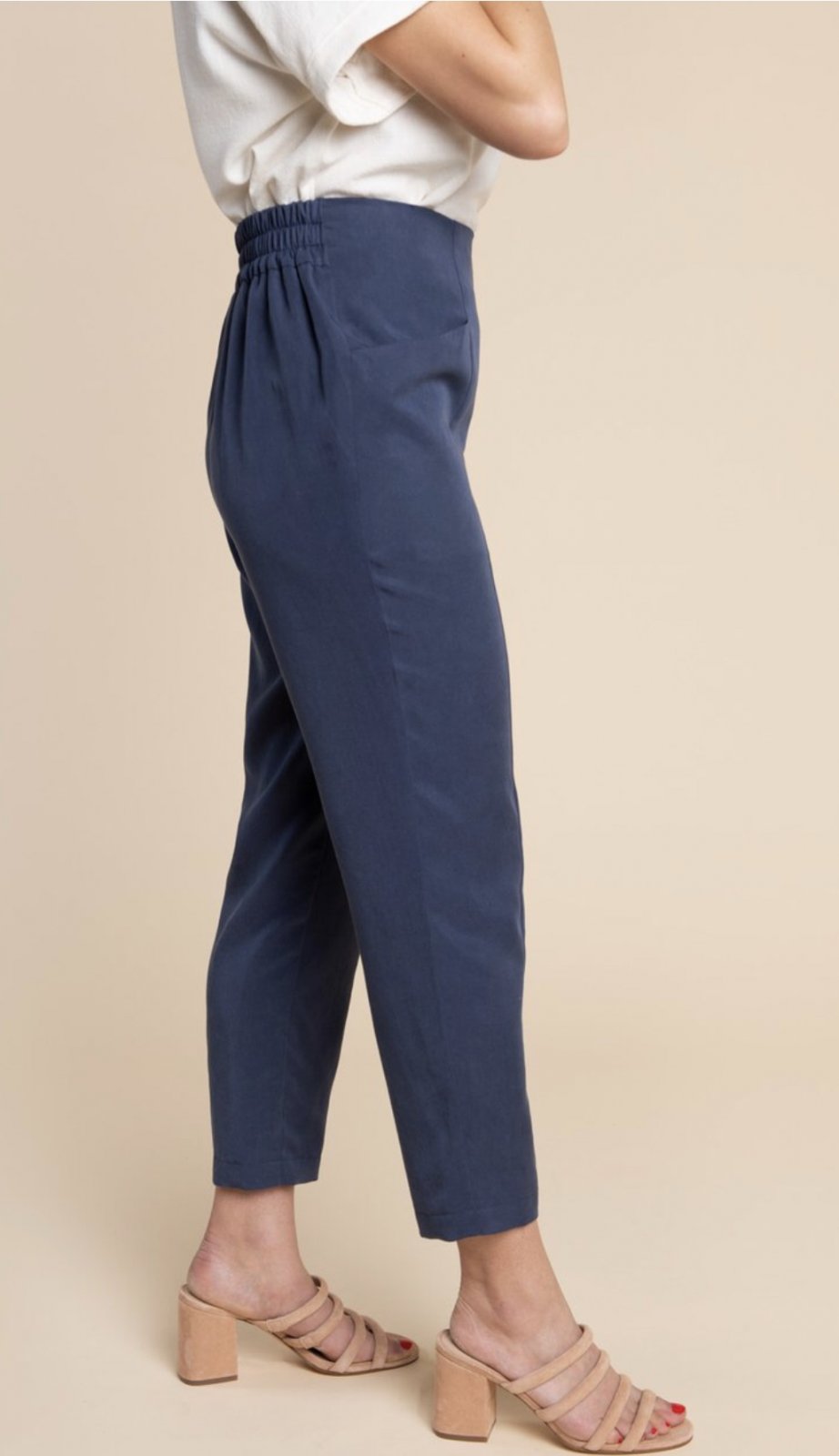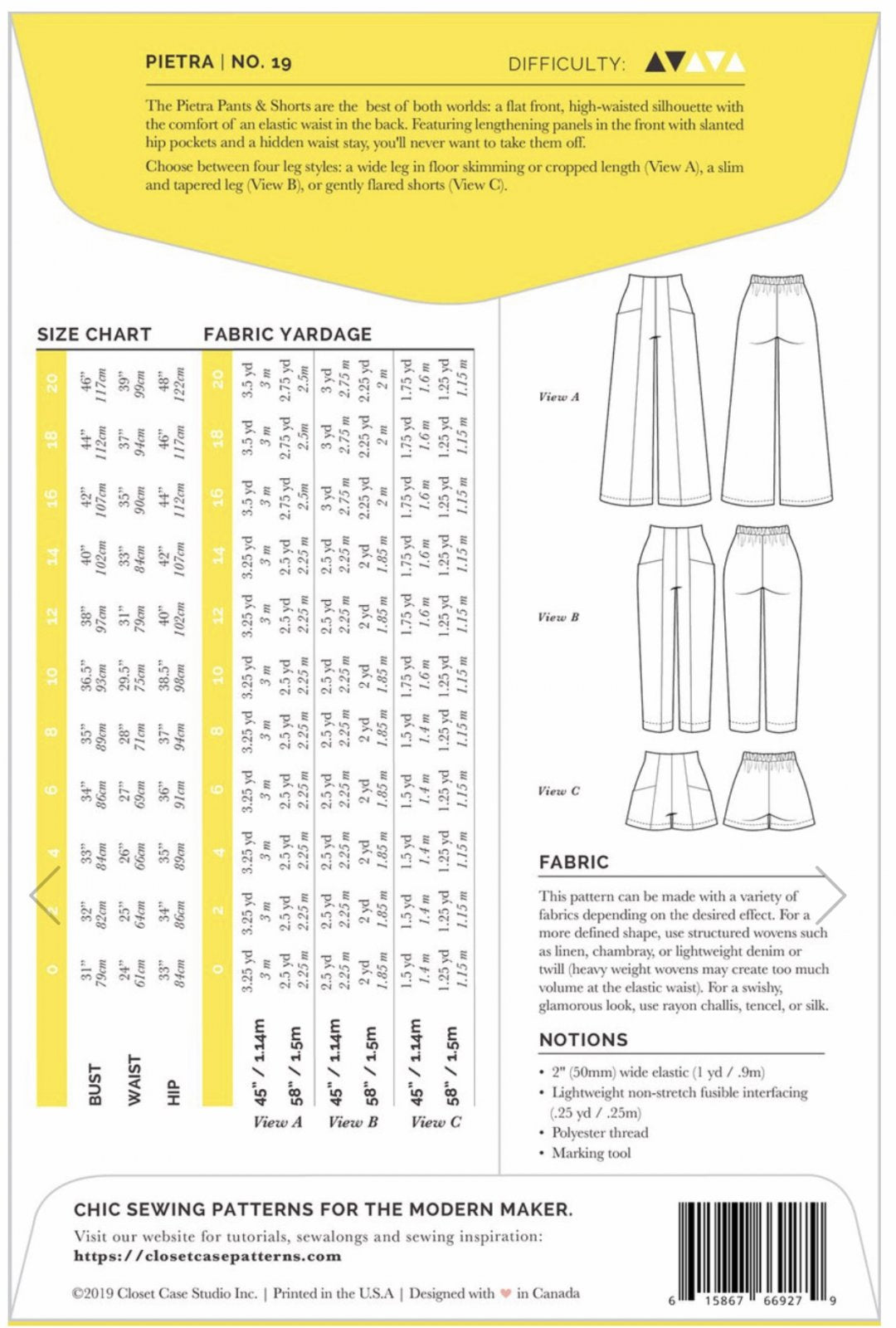 The Closet Case (now Closet Core) Pietra Pants & Shorts Pattern combines effortless style with everyday comfort. Designed with a flattering high-rise, flat front, and comfortable elastic back waist, Pietra is the perfect blend of polished and relaxed. Featuring lengthening front panels, slanted hip pockets, and a hidden waist stay, these pants are as functional as they are chic. Choose from four versatile styles: wide-leg trousers in full or cropped lengths, slim tapered pants, or breezy flared shorts. Ideal for both structured fabrics like linen and twill or drapey fabrics like rayon, tencel, and silk, Pietra is a wardrobe staple that works year-round.