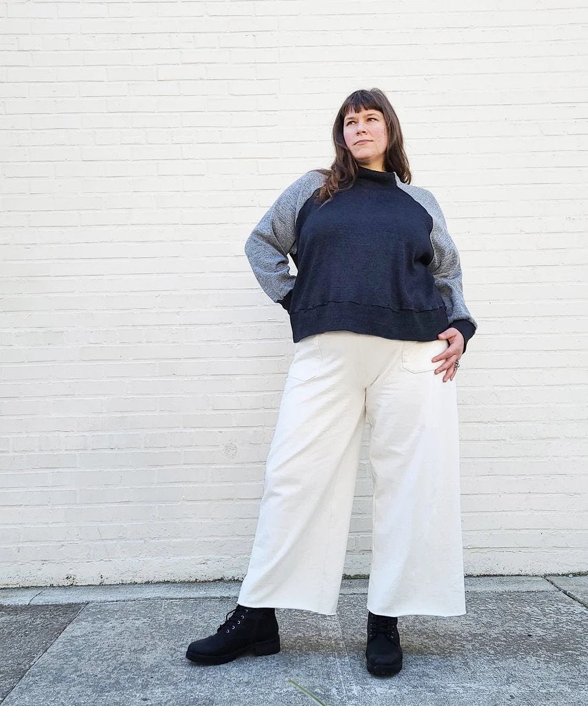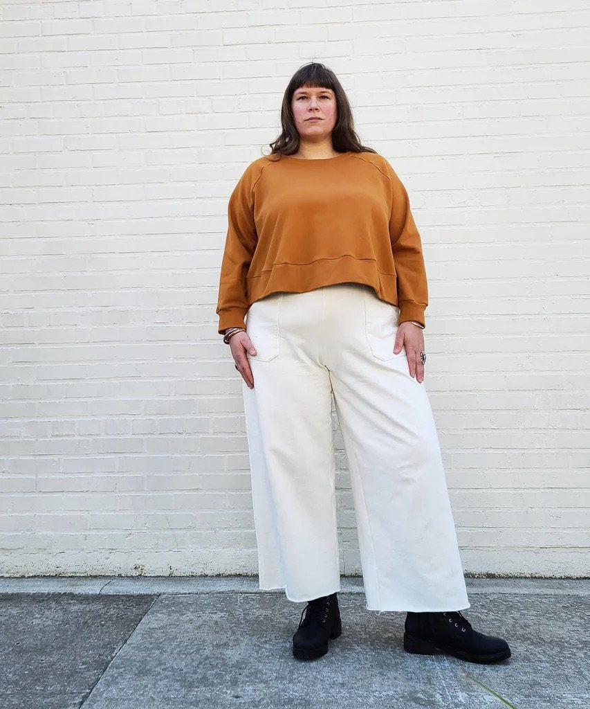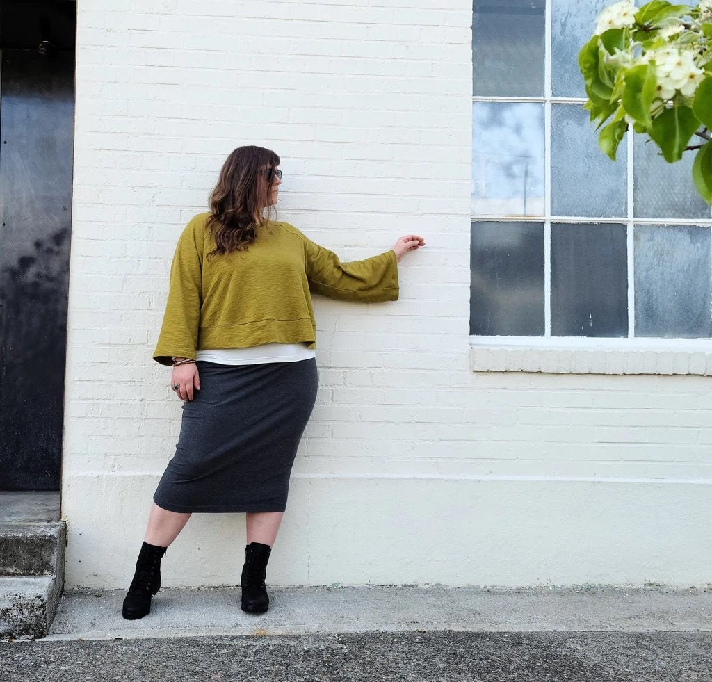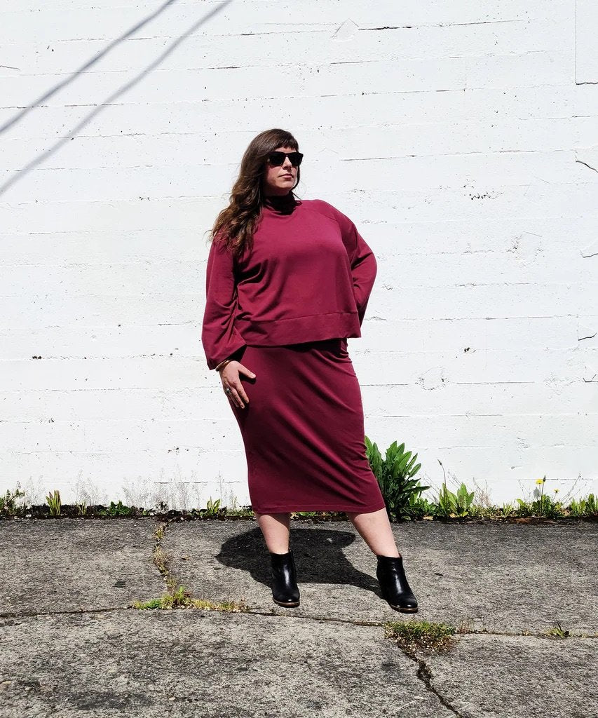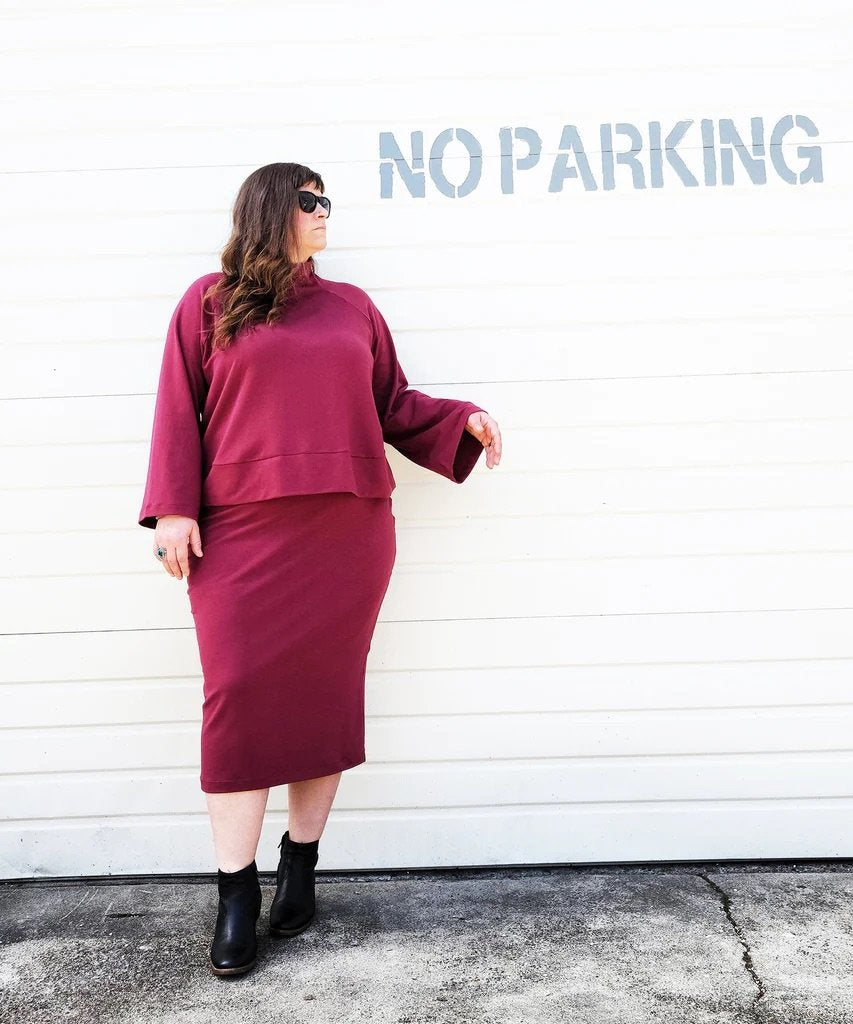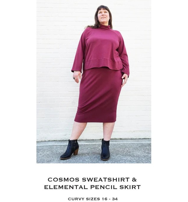 Sew House Seven – Cosmos Sweatshirt & Elemental Pencil Skirt (Curvy Sizes) is a stylish and beginner-friendly sewing pattern set designed with curves, comfort, and versatility in mind. The Cosmos Sweatshirt is an oversized raglan knit top with two neckline options and two sleeve styles, finished with a wide bottom band that sits just above the hip. The Elemental Pencil Skirt is a slim, high-waisted knit skirt featuring a hidden elastic waistband—perfect for a polished look with all-day comfort.