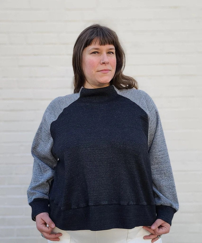• Cosmos Sweatshirt: oversized raglan design, wide bottom band, two neckline options: funnel neck (Version 1) or curved neckband (Version 2)
