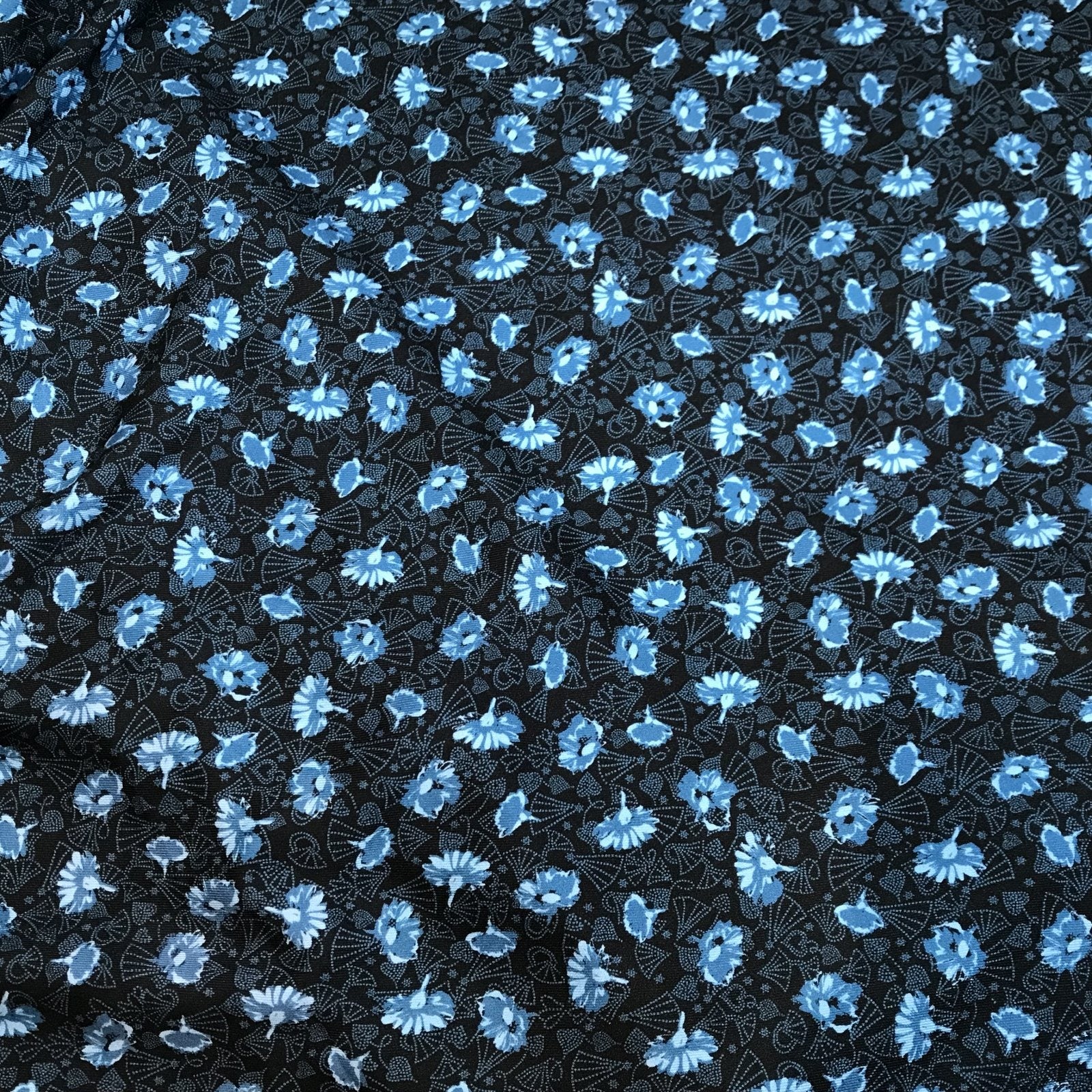 French Viscose Black and Blue Dandelion Fabric – Soft, Lightweight, Drapey Floral Print Material for Dressmaking