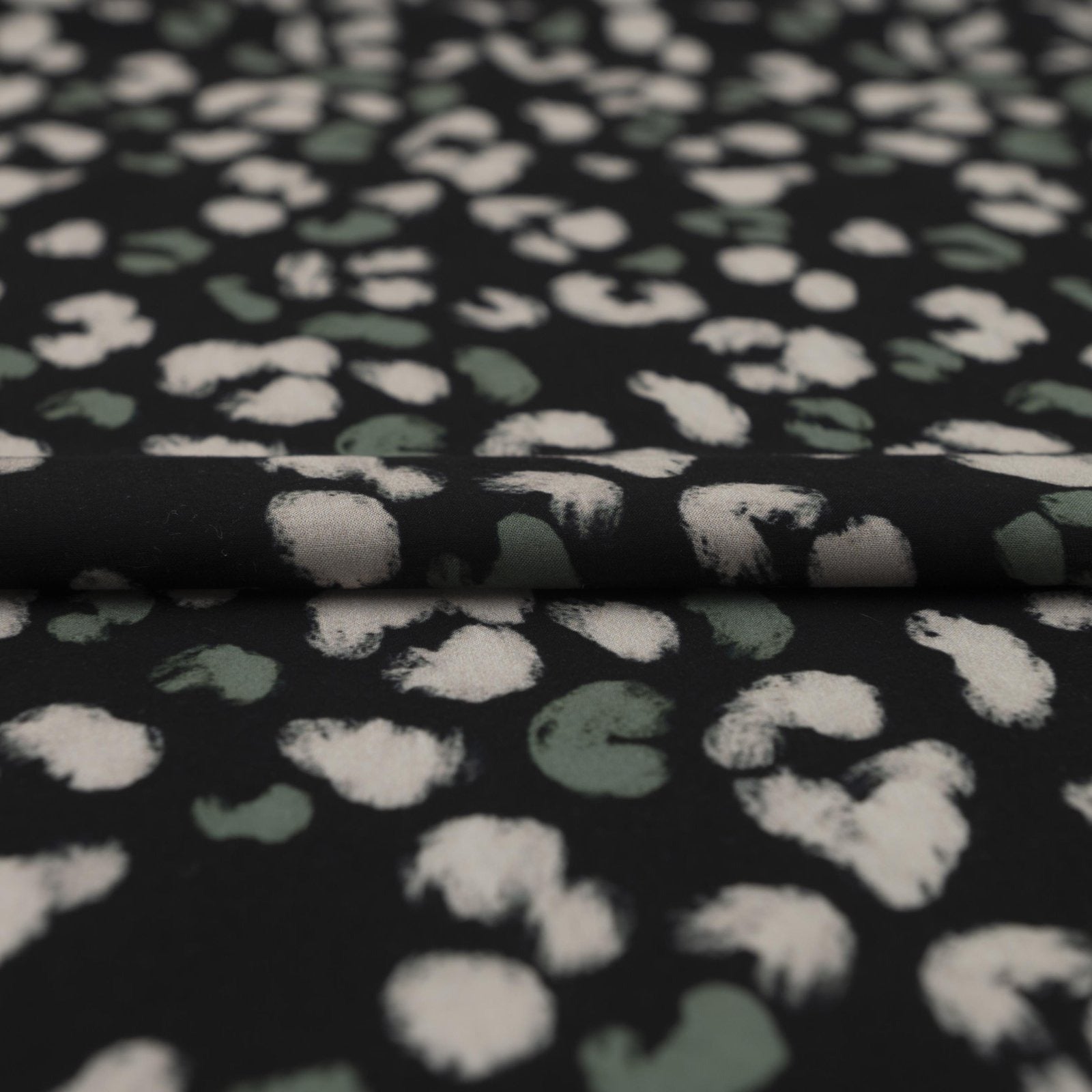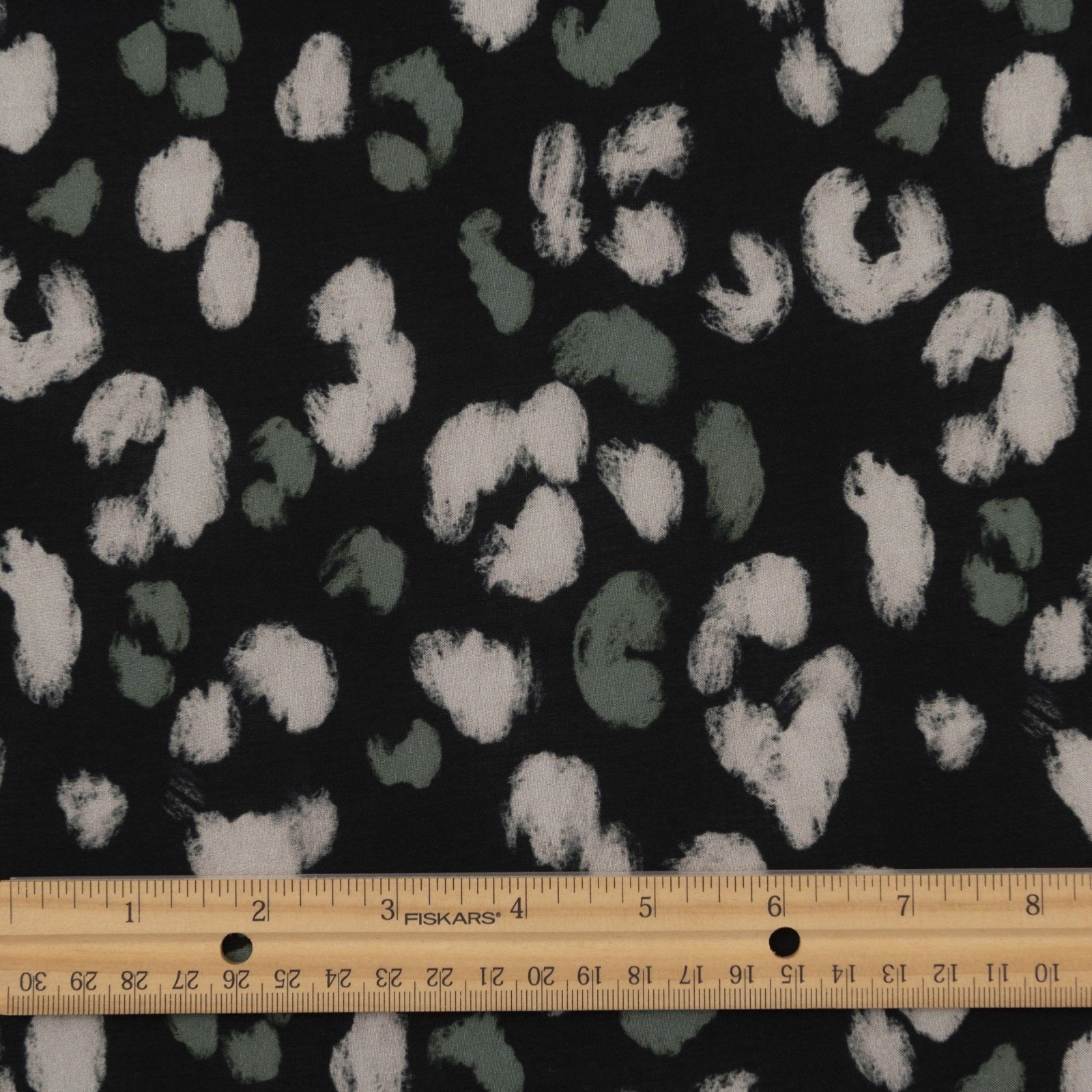 Rayon Challis fabric in black with scattered olive dots, perfect for sewing blouses, dresses, and skirts.