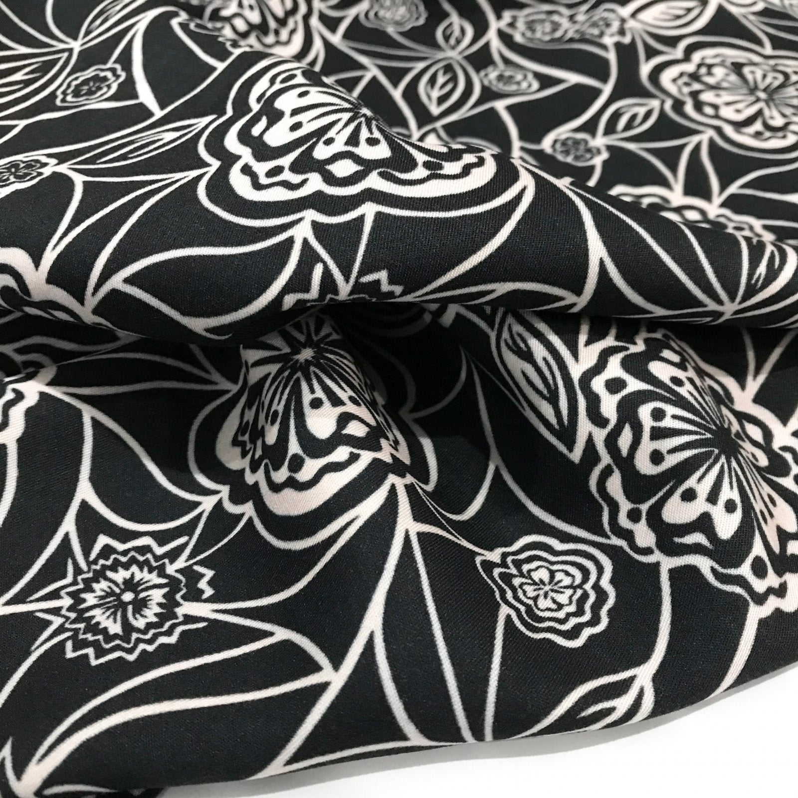 The Organic Tencel Twill – “Rowdy Patch – Black” is an eco-friendly, small-batch fabric designed for elevated fashion. With its whimsical print, soft drape, and fully opaque finish, it brings sophistication and sustainability to every handmade garment.