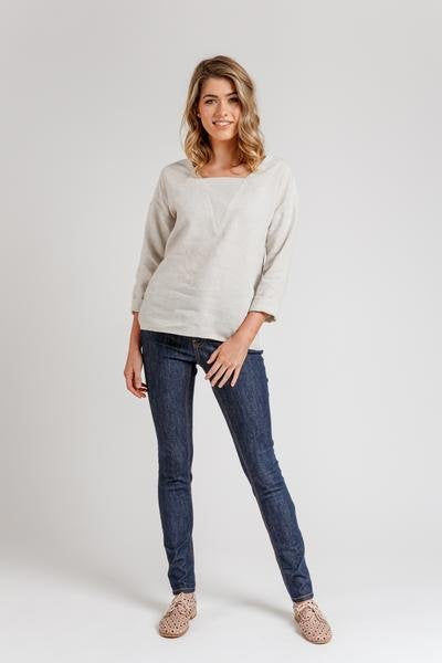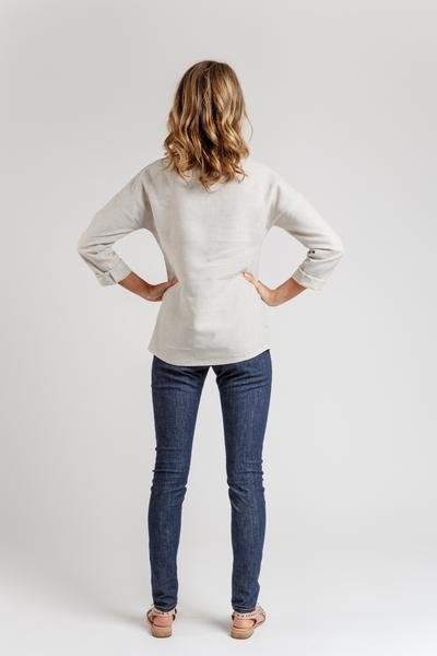 The Megan Nielsen – Olive pattern is a relaxed-fit top and dress designed with a flattering V-insert and versatile styling options. With a drop shoulder, multiple sleeve finishes, and optional breast patch pocket, this pattern allows you to create stylish everyday wear. View A is a blouse with a V-neck insert and patch pocket, View B is a dress with a V-neck insert, sleeve bands, and inseam pockets in a gathered skirt, and View C is a blouse with long sleeves and a V-neck insert. Perfect for light- to medium-weight fabrics with drape, the Olive pattern is comfortable, chic, and adaptable for any wardrobe.