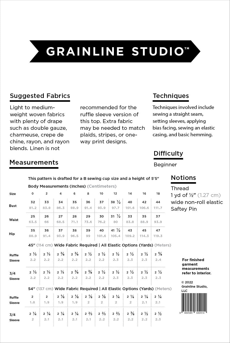 The Grainline Studio Corbin Top is a stylish and versatile drapey drop-shoulder top designed for sizes 0–18 (bust 32–44 inches). It features a wide round neckline and offers two sleeve options: a ruffled cap sleeve and a straight 3/4-length sleeve. An optional gathered elastic detail at the front and back waist adds shaping and visual interest, allowing for six unique design combinations. Perfect for beginner sewists, this pattern introduces essential sewing techniques including straight seams, setting sleeves, applying bias facing, sewing an elastic casing, and basic hemming. Suggested fabrics include light to medium-weight woven fabrics with good drape such as double gauze, charmeuse, crepe de chine, and rayon blends.