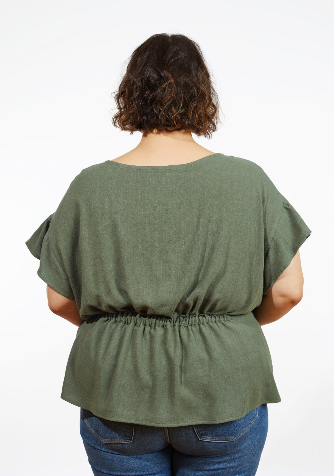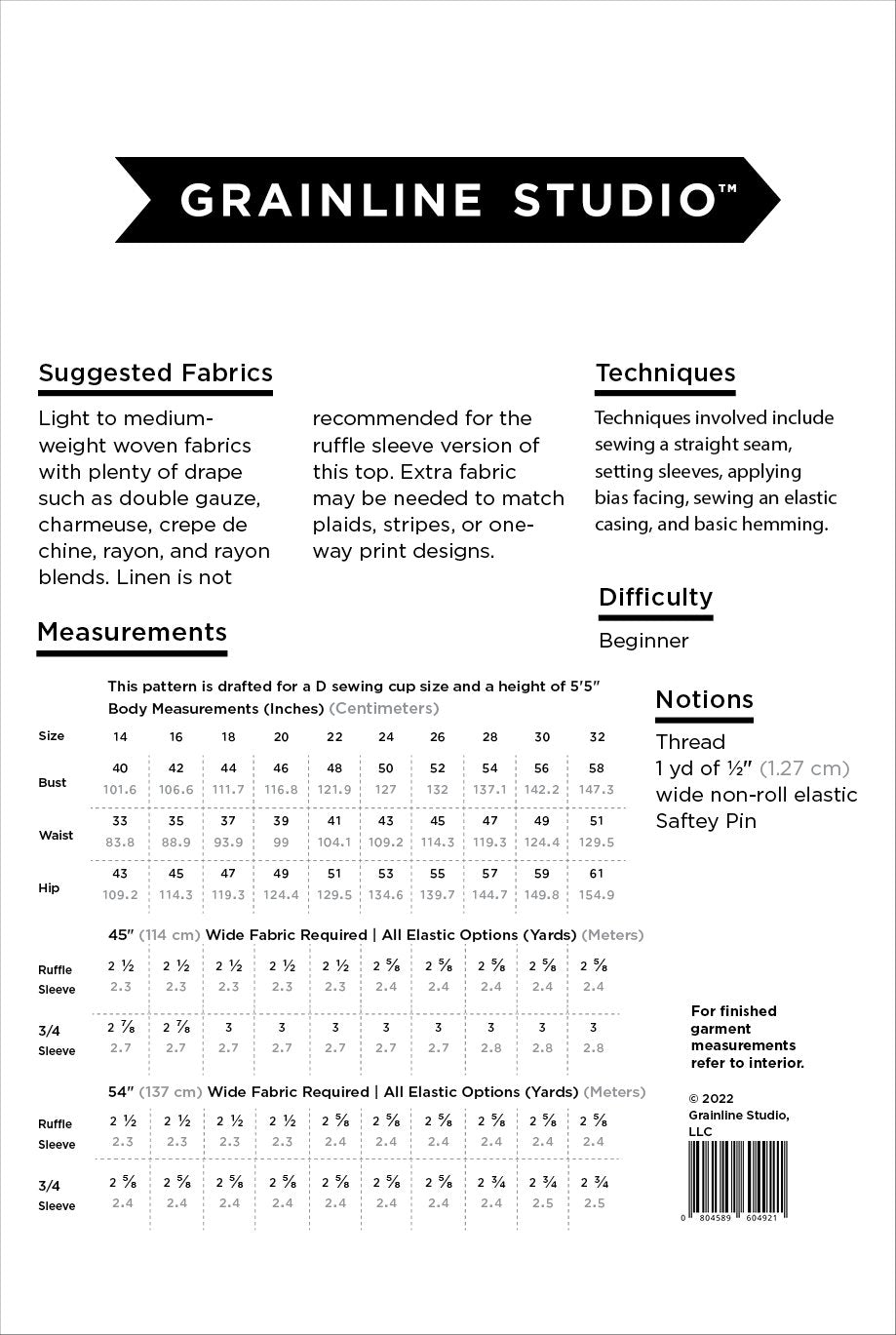 The Grainline Studio Corbin Top is a versatile, drapey drop-shoulder top designed for sizes 14–32 (bust 40–58 inches). Featuring a wide round neckline, it offers two sleeve options: a ruffled cap sleeve or a straight 3/4-length sleeve. An optional gathered elastic detail at the front and back waist adds shaping and style, allowing for six unique design combinations. Perfect for beginner sewists, the Corbin Top teaches essential techniques including straight seams, setting sleeves, applying bias facing, sewing elastic casings, and basic hemming. Suggested fabrics include light to medium-weight woven fabrics with plenty of drape, such as double gauze, charmeuse, crepe de chine, and rayon blends.