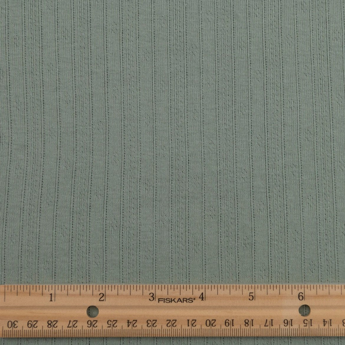 Create effortlessly elegant warm-weather garments with our Soft Sage Pointelle Cotton Knit, a breathable 100% cotton fabric featuring a delicate openwork design. This lightweight 7.67oz knit offers 60% crosswise stretch for comfortable movement, making it ideal for flowy summer dresses, breezy tops, and lightweight cardigans. The muted sage green hue provides versatile styling options that transition beautifully through seasons, while the 58" width allows for efficient cutting with minimal waste. The fabric's geometric pointelle pattern adds subtle texture and visual interest to elevate any project. As a limited deadstock item, this high-quality knit offers exceptional value for sewists seeking premium materials.
