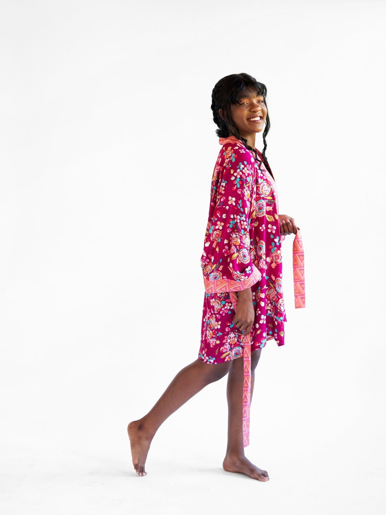 Relax in elegance with the Magenta Moment Signature Robe, a perfect blend of comfort, style, and luxury. Made from lightweight rayon, this robe features a bright floral print that brightens up your loungewear collection. With a deep front overlap, 100% printed cotton edgings, and an interior tie for extra security, this robe ensures a flattering fit while keeping you cozy. Designed in a traditional kimono style, it’s roomy enough for a relaxed fit but can be sized down for a more fitted look. The robe’s 36" length from nape to hem adds the perfect touch of sophistication, making it ideal for unwinding or lounging around the house.