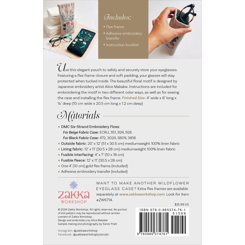 Create a beautifully handcrafted accessory with the Wildflower Eyeglass Case Kit, featuring an elegant floral motif designed by Japanese embroidery artist Alice Makabe. This kit allows you to make a padded eyeglass pouch with a secure flex frame closure, keeping your glasses safely protected inside. It includes a flex frame, an adhesive embroidery transfer, and a detailed instruction booklet with guidance for stitching the motif in two color variations, as well as clear steps for sewing and assembling the case. With a finished size of 4" x 8" x ½", this project is perfect for makers who love embroidery, handcrafting, and functional fabric accessories.