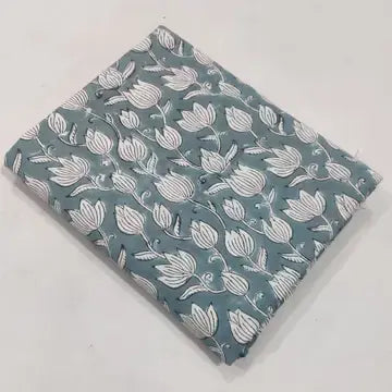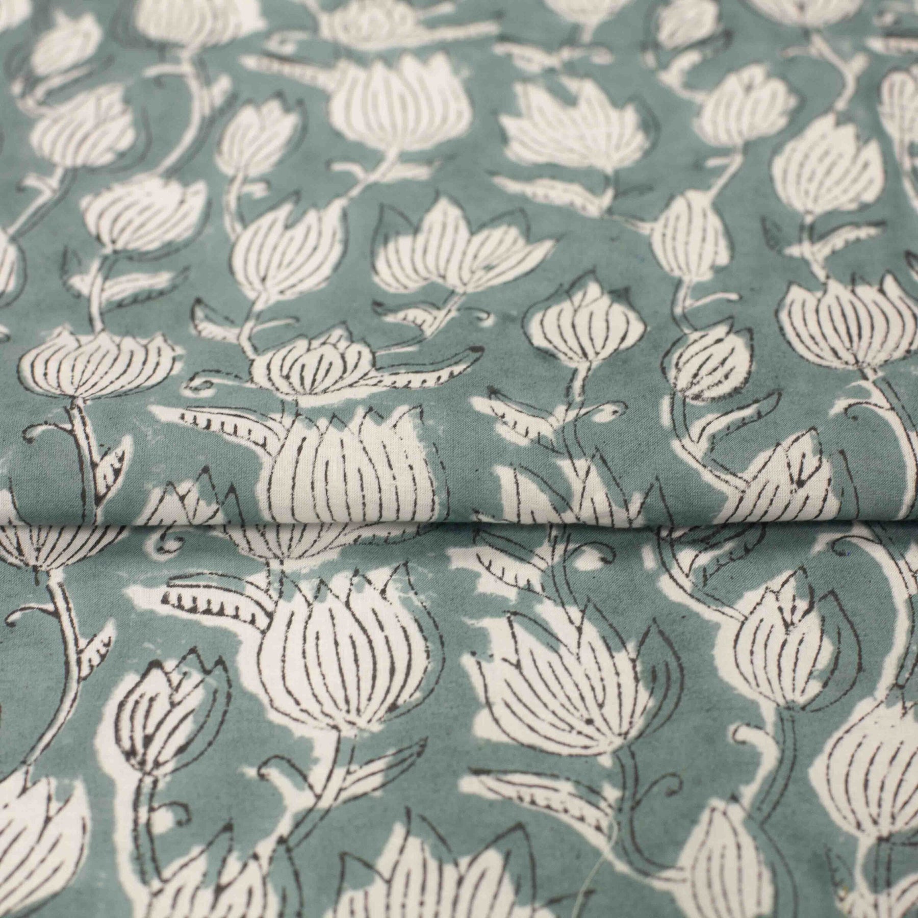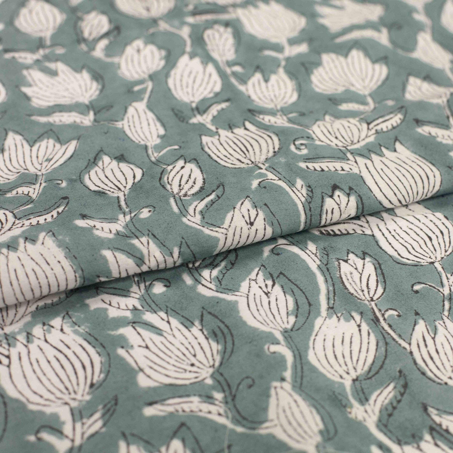 Discover understated elegance with this hand-printed 100% Indian cotton fabric, featuring delicate white tulips against a sophisticated vintage grey-green background with teal undertones. This artisanal print combines subtle beauty with artistic craftsmanship, creating a fabric that's both visually striking and effortlessly wearable. The semi-translucent lightweight weave (2.1oz) offers exceptional breathability and gentle drape, making it perfect for airy blouses, summer dresses, and elegant layering pieces. Whether you're creating wardrobe staples or special occasion wear, this fabric's soft handfeel and timeless floral motif will elevate your handmade creations with quiet sophistication.