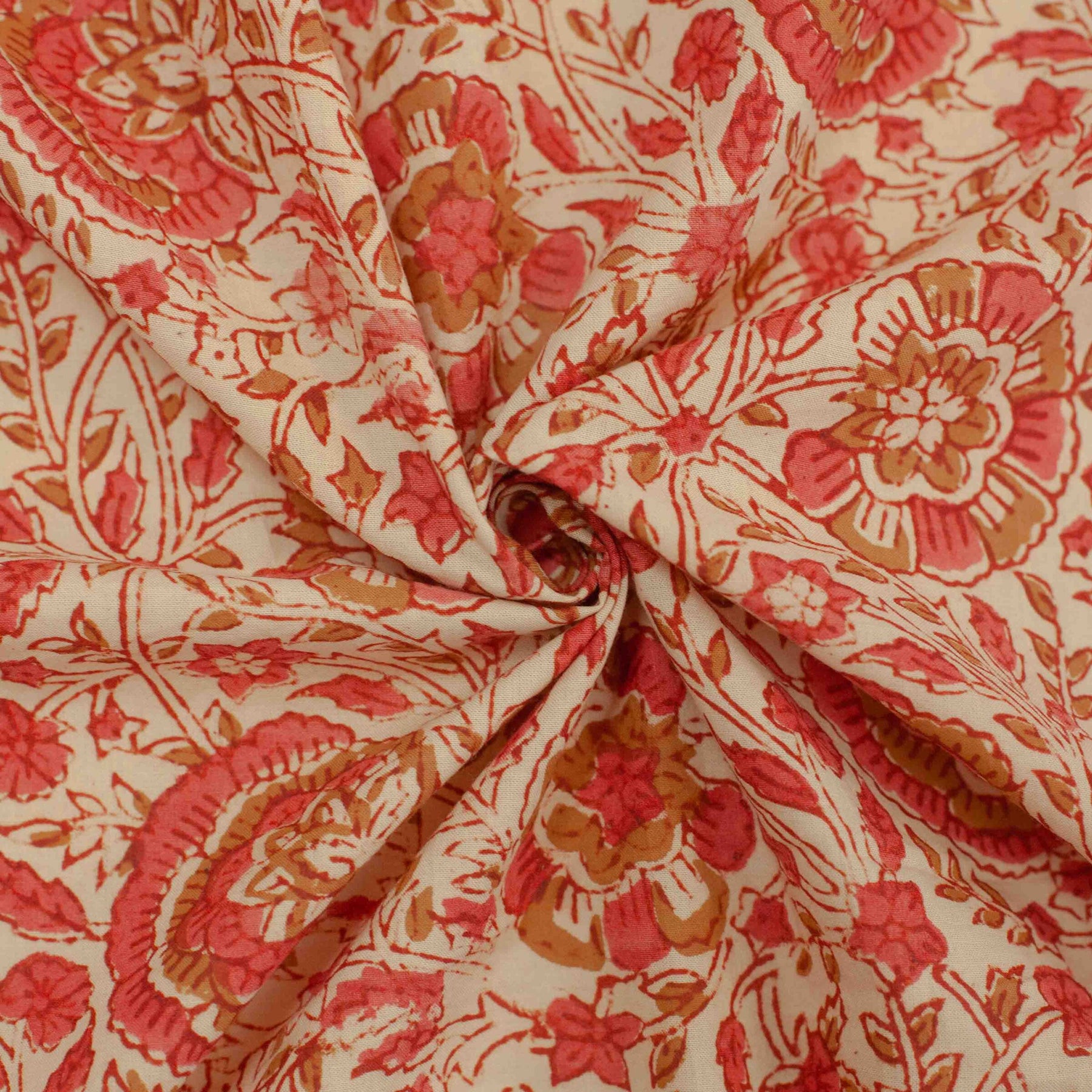 Embrace timeless elegance with this handcrafted Indian cotton "Cottage Garden" print, featuring a delicate Sanganer block print in warm hues of ecru, ochre, red, and pink. Made from lightweight, breathable GOTS-certified organic cotton (2.5 oz/yd²), this fabric is perfect for flowy tops, full skirts, romantic dresses, and breezy home décor like curtains and scatter cushions. Each piece showcases intricate detailing, a hallmark of traditional Indian craftsmanship, with subtle variations that celebrate its artisan-made charm. Whether you're sewing a bohemian-inspired wardrobe or adding a touch of soft elegance to your home, this fabric brings gentle color and artisanal beauty to every creation.
