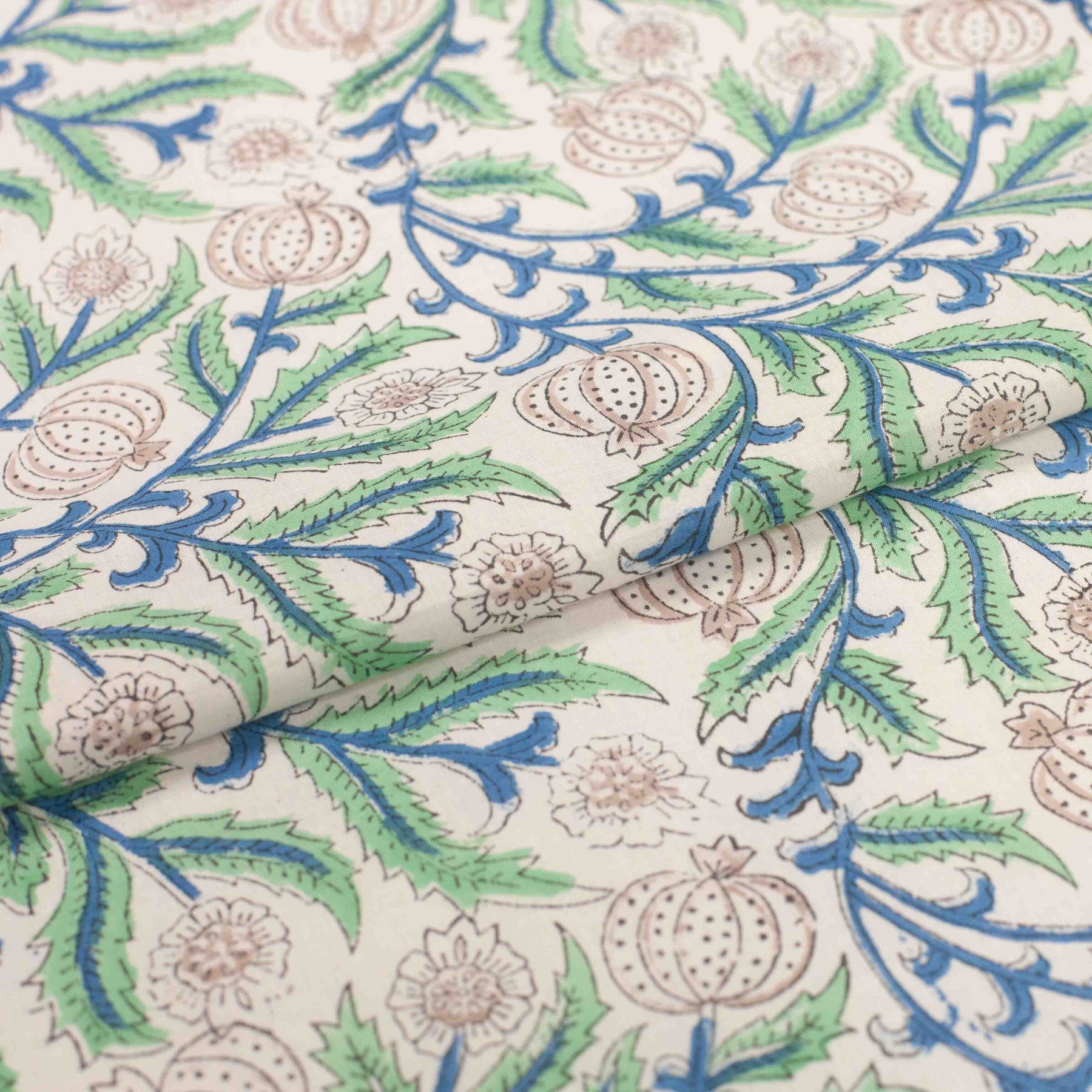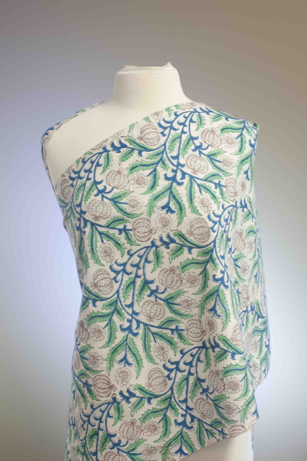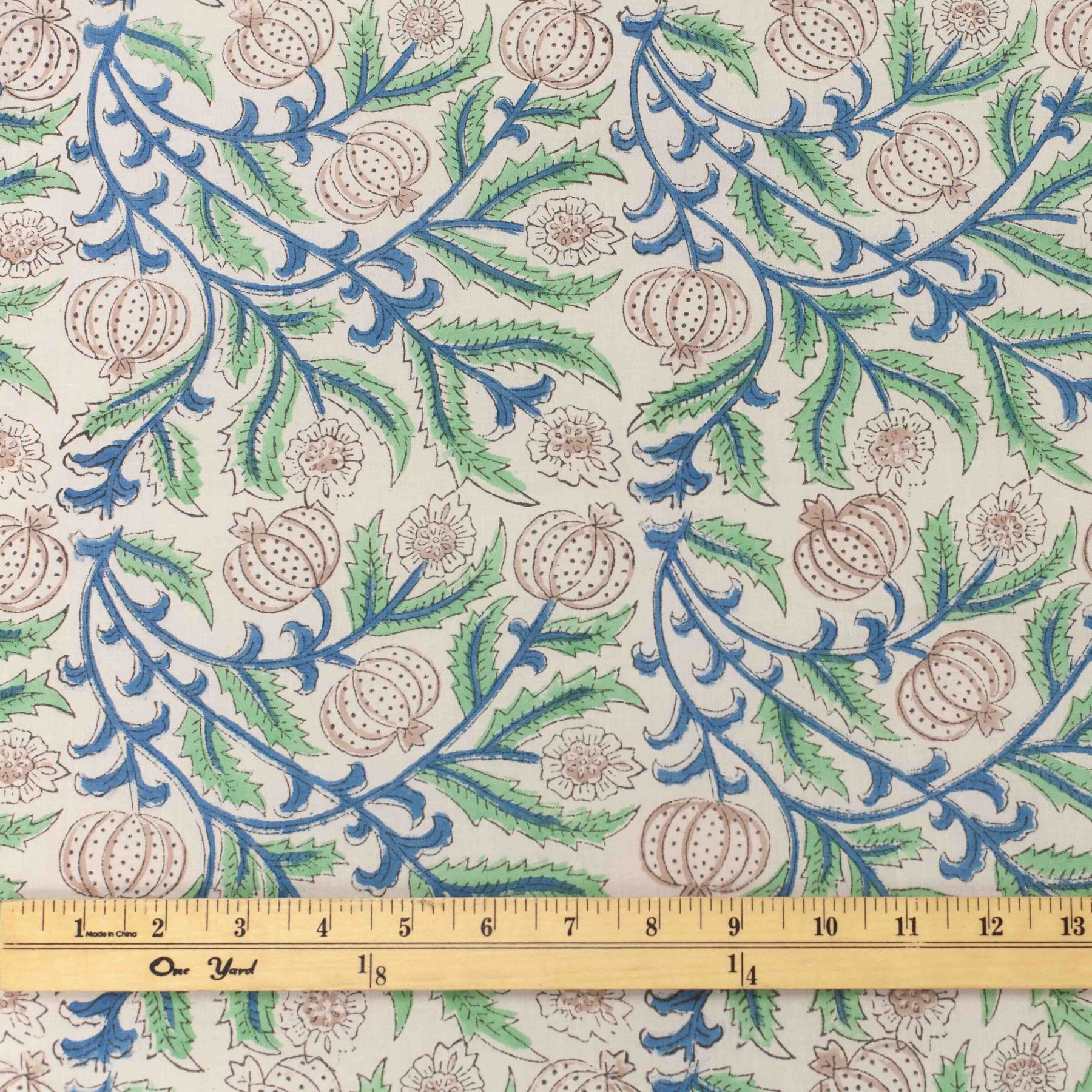 Bring nature's whimsy to your wardrobe with this hand-printed 100% Indian cotton fabric, featuring curling blue and green vines and charming hand-drawn bulbous blooms against a crisp white background. This unique print blends modern freshness with folkloric charm, evoking images of garden-fresh gourds and vegetables in a delightfully artistic composition. The semi-translucent lightweight weave (2.1oz) offers exceptional breathability and drape, making it perfect for summer blouses, sundresses, and lightweight layering pieces. With its soft handfeel and playful botanical design, this fabric adds a touch of organic personality to every handmade creation.