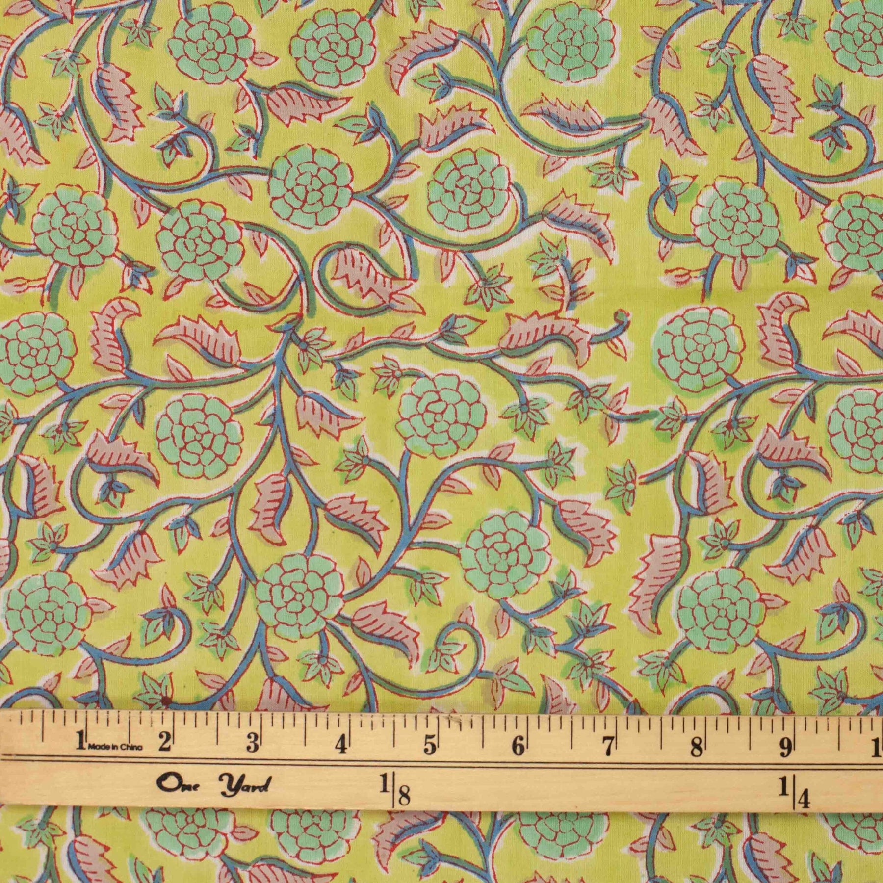 Bring your creative visions to life with this handcrafted 100% Indian cotton fabric, featuring a lime green background adorned with intricate blue vines, lush pink leaves, and distinctive round flower bulbs. This vintage-inspired botanical print exudes charm and character, perfect for crafting soft, lightweight sundresses, blouses, and unique garments. The semi-translucent, breathable weave (70g per meter) ensures exceptional comfort, making it ideal for warm-weather wear. Whether you're a seasoned sewist or DIY enthusiast, this fabric's unique design and premium quality will elevate your handmade creations with effortless style.