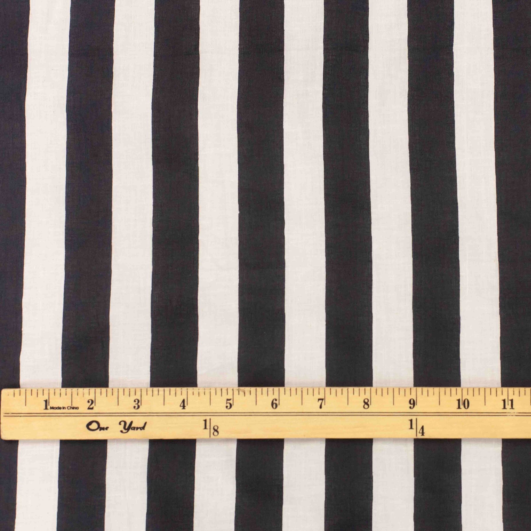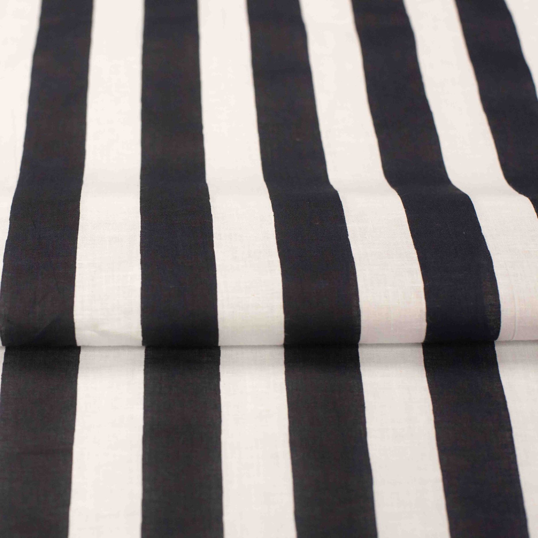 Elevate your sewing projects with our Indian Cotton Stripe fabric in a classic navy and white design. This 100% cotton fabric features bold 1" stripes, making it perfect for creating stylish wide-leg pants, breezy dresses, crisp shirts, and chic home décor. With a 44" width and a lightweight, semi-translucent texture (70g per meter), this fabric is easy to work with while offering breathable comfort. Its timeless aesthetic adds a polished, sophisticated touch to any handmade creation.