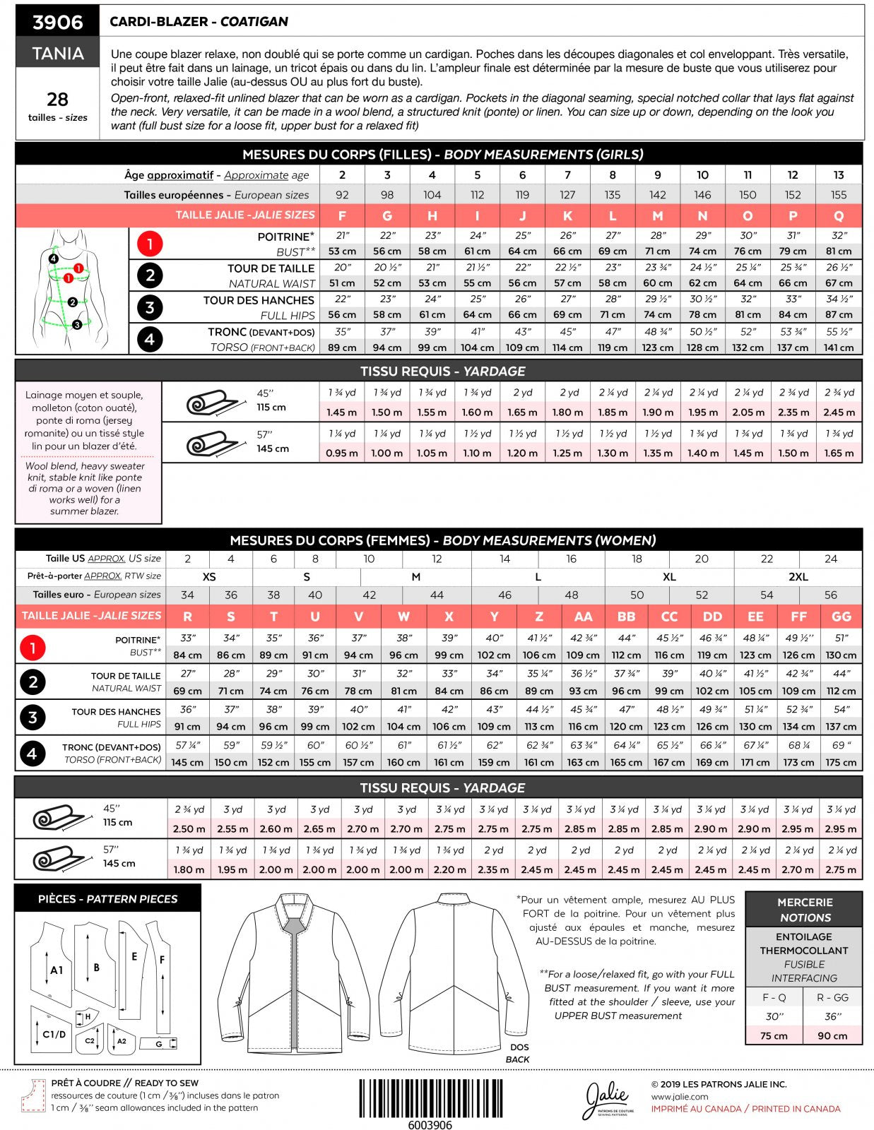The Jalie - Tania Cardi-Blazer / Coatigan is a versatile open-front, relaxed-fit blazer that doubles as a cozy cardigan. Designed with diagonal seam pockets and a special notched collar that lays flat against the neck, this pattern is both stylish and functional. It can be made in a variety of fabrics, including wool blends, stable knits like ponte, heavy sweater knits, or linen for a lightweight summer blazer. The Tania can be sized up or down depending on your desired fit—choose full bust size for a loose, oversized look or upper bust size for a more relaxed, fitted style. With 28 sizes included, it’s perfect for Girls 2-13 and Women’s XS – 2XL.