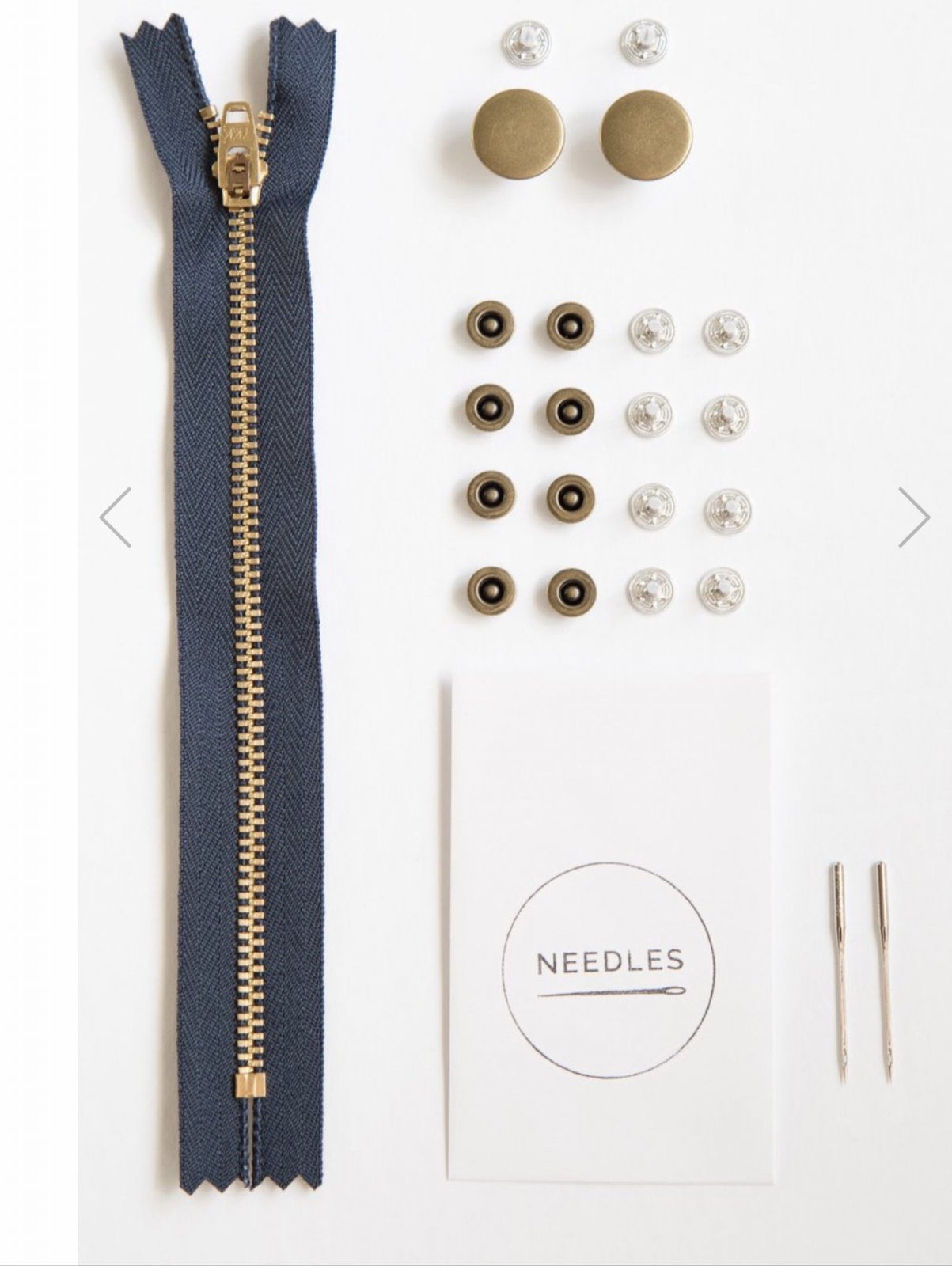 Simplify your denim crafting with this Jeans Making Kit - Zipper Fly, containing all the premium components needed to create professional-quality jeans. This complete kit includes 8 rivets, 2 jeans buttons (choose from copper, brass, or nickel finishes), a durable 7" YKK zipper, and 2 Schmetz jeans needles – everything required for a flawless fly front construction. Perfect for DIY enthusiasts and tailors, this kit eliminates the hassle of sourcing individual notions, letting you focus on crafting your perfect pair of jeans with confidence.