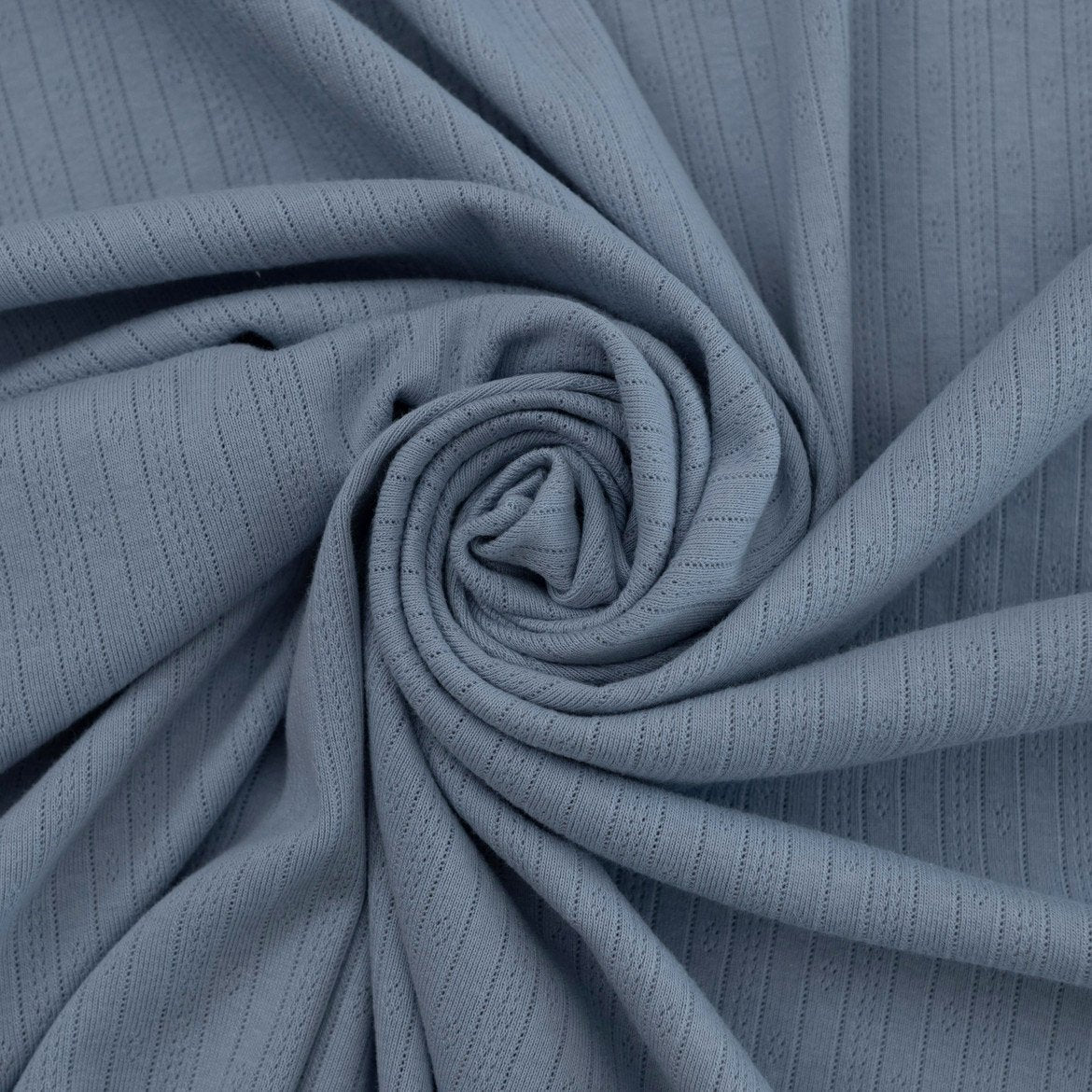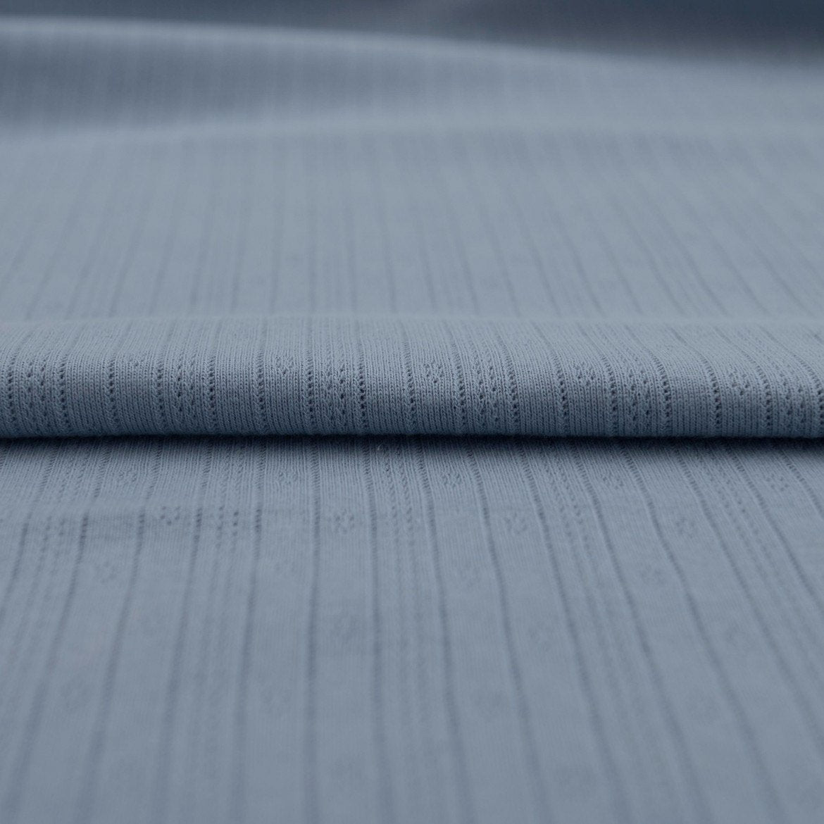 Crafted from 100% premium cotton, our Dusty Blue Pointelle Knit combines breathable comfort with eye-catching texture. This lightweight (7.67 oz) fabric features a delicate openwork pattern of geometric diamonds and stripes, offering 60% crosswise stretch for ease of movement while maintaining structure. The soft, dusty blue hue adds a touch of understated elegance, perfect for flowy summer dresses, breezy tops, and lightweight cardigans.