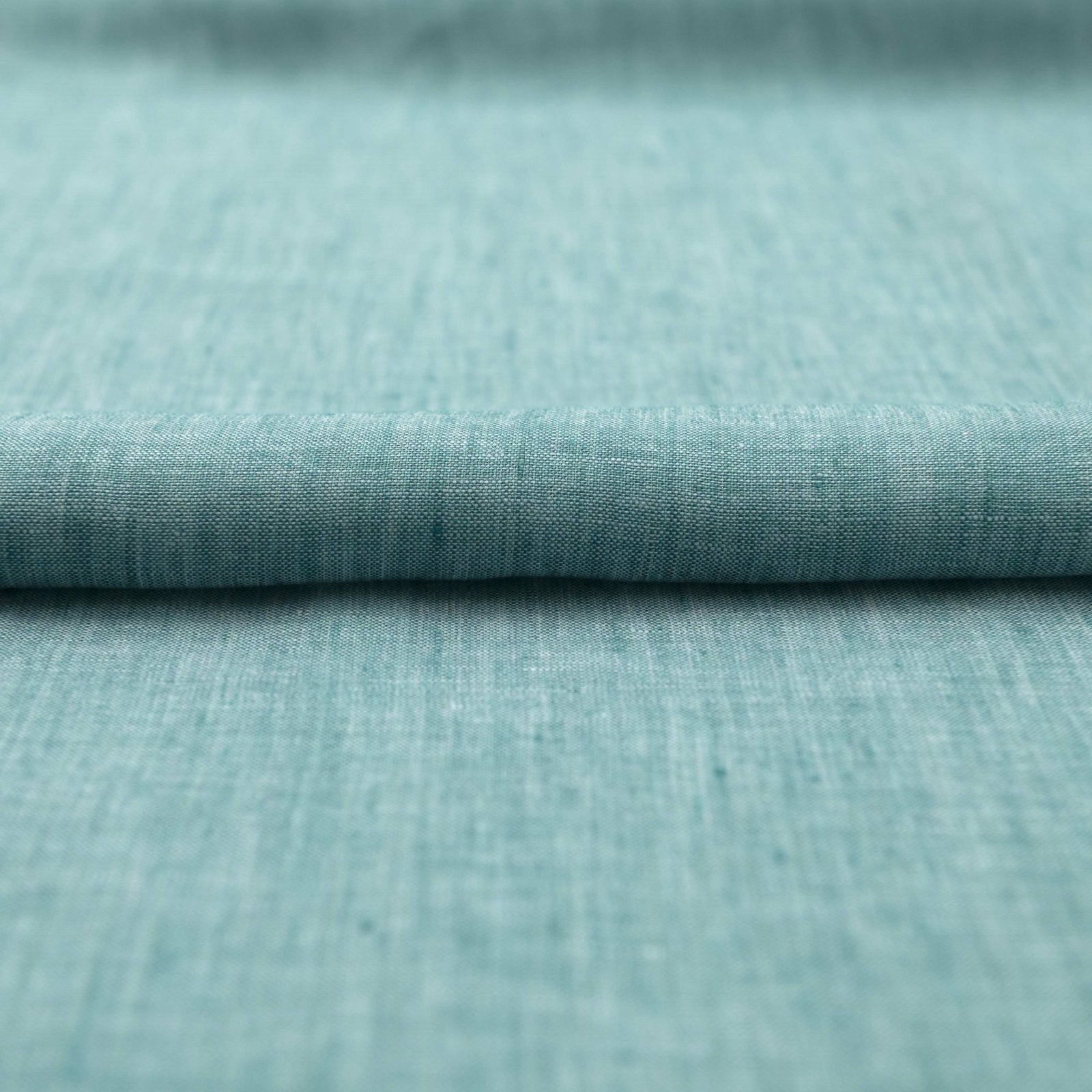 Teal linen chambray fabric, lightweight and breathable, with a soft texture ideal for sewing dresses, tunics, blouses, and year-round apparel.
