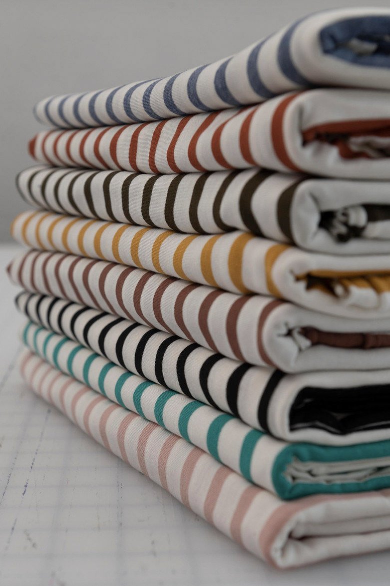 This Striped Rayon Jersey is a dream fabric for sewists who love softness, movement, and effortless style. The breathable rayon blend drapes beautifully, while the spandex content ensures a flattering fit. With seven stripe colorways to choose from, you can create unique, eye-catching garments. Deadstock alert—once it's gone, it's gone!