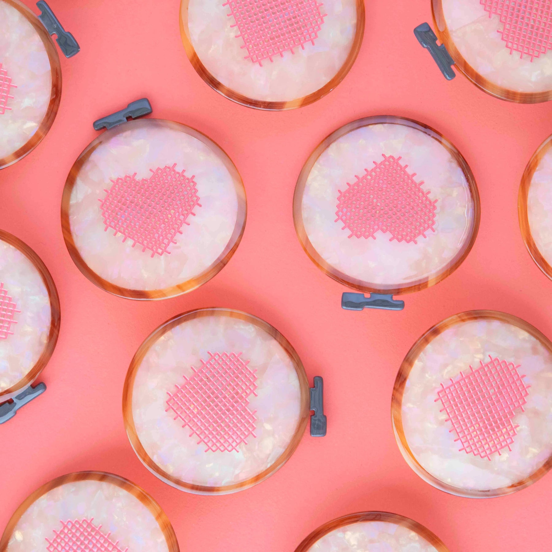 Celebrate your love of making with this charming Cross Stitch Embroidery Hoop Barrette—a sweet nod to needlecraft, handmade style, and creative flair. Shaped like a round embroidery hoop with a soft curve, this clip features a pearly white base embossed with a pink cross-stitched heart—an adorable tribute to your favorite hobby.
