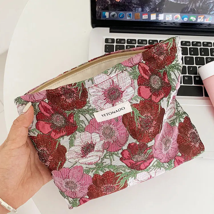 This embroidered notions bag features a bold poppy design in warm rose and red tones, creating a rich, expressive look. The detailed jacquard fabric highlights the layered florals, giving the piece both texture and depth.