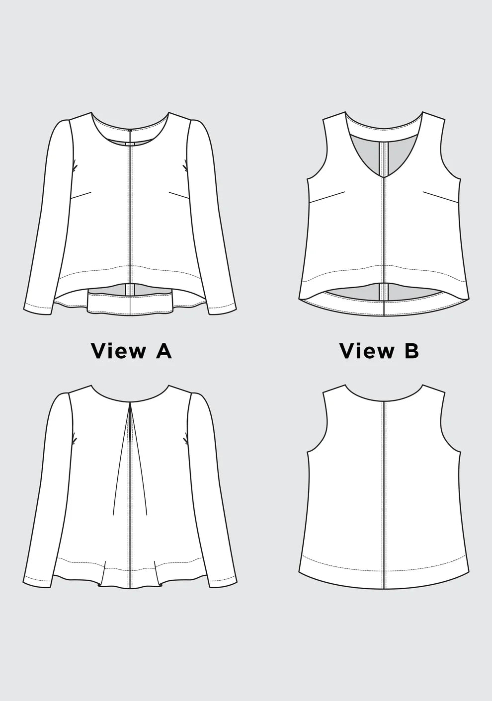 The Grainline Studio - Hadley Top Pattern is a sophisticated, drapey, and versatile sewing pattern perfect for both workwear and casual outings. View A features a jewel neckline, back pleat, and bracelet-length sleeves, while View B is sleeveless with a soft V-neck. Both versions showcase subtle geometric details with center seams on the front and back, complemented by a wide hem for a polished finish. Designed for light to medium-weight woven fabrics such as cotton, linen, silk, rayon, voile, or lawn, the Hadley Top is ideal for creating elegant, fluid garments that drape beautifully without stiffness.