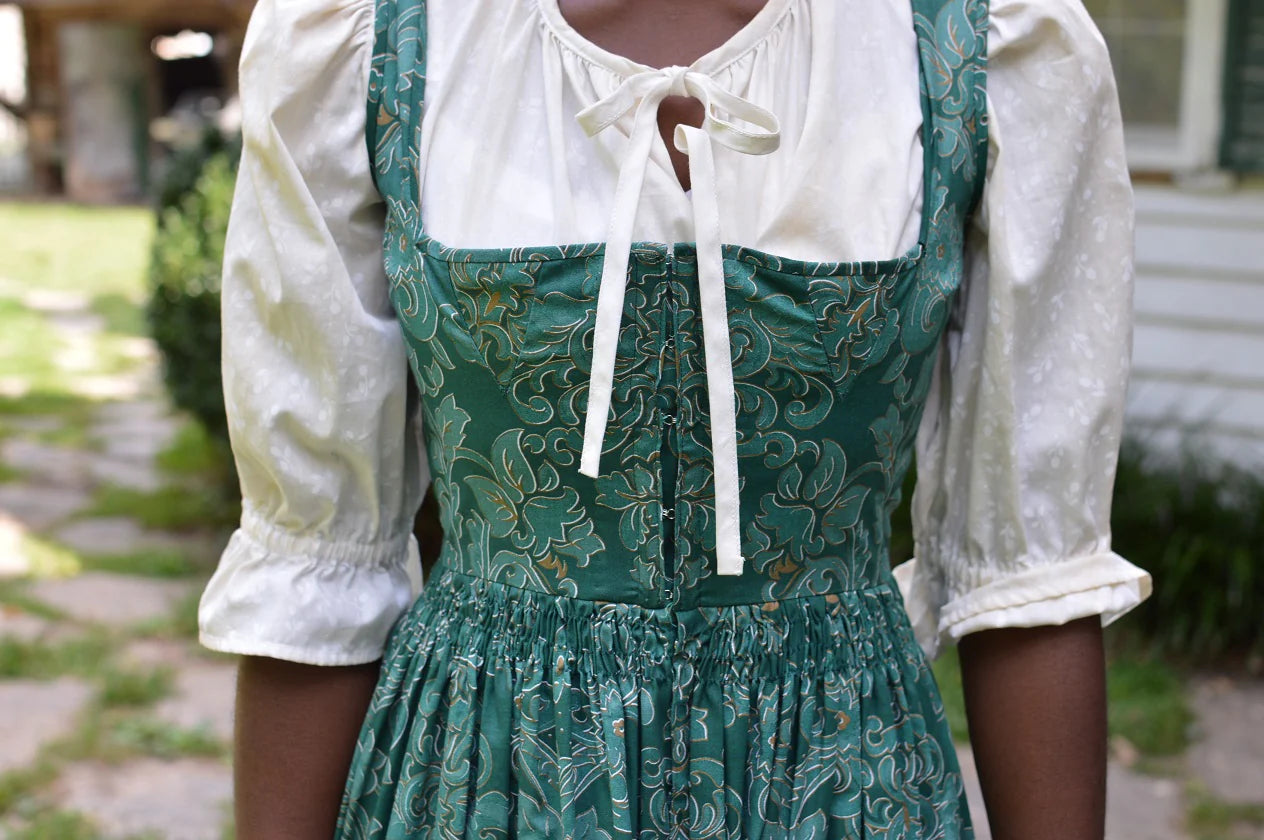 The Dirndl dates back to the Renaissance and remains a cherished traditional garment in Austria, southern Germany, and Switzerland. It's also a perennial favorite at Renaissance Faires and Oktoberfests. This three-piece ensemble includes a close-fitting, sleeveless bodice with attached full skirt, a cropped blouse, and a contrasting apron—all designed to enhance the romantic, folkloric feel of the look.