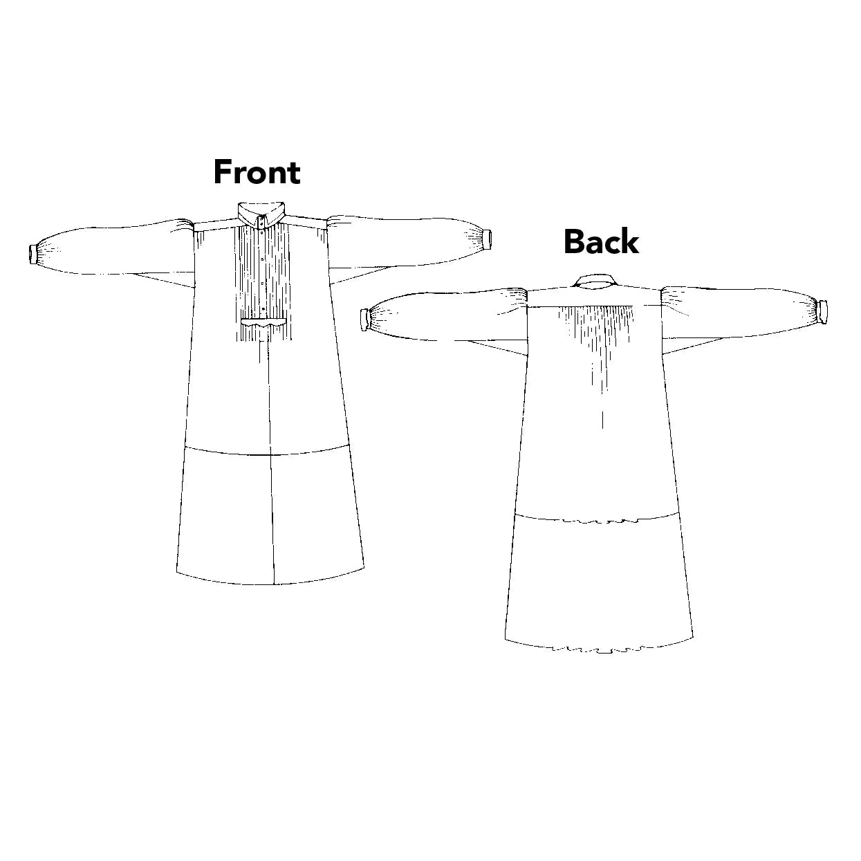 The pattern features a simple but refined silhouette, made from straight fabric panels with front tucks and soft pleats that shape into a shoulder yoke at front and back. Full sleeves are gathered into cuffs with gussets under the arms for ease of movement. A notched collar and front button placket reflect the influence of early 20th-century tailoring, blending rural and urban style.