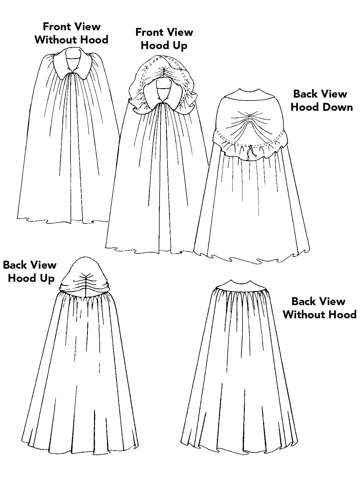 The Kinsale Cloak is ankle-length on an average height (5'7") adult and features elegant hand gathering into a wide collar, which allows the cloak to fall in soft, graceful pleats. It fastens at the neck with a classic hook-and-eye closure and includes an optional, detachable hood for women. The hood can be worn loose as an over-cape or tied under the chin for a dramatic silhouette. Without the hood, the cloak offers a dashing and historically accurate look for men.