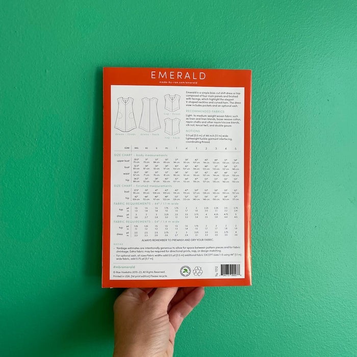 The Emerald Dress by Made By Rae is a simple, elegant shift dress or top pattern designed for comfort during the summer heat. The design features four main panels, a V-shaped neckline, and a curved hem for a flattering silhouette. You can add optional pockets or a sash to the dress version for extra customization. This printed pattern includes a complete instruction booklet and full-sized pattern pages, making it easy to sew your perfect dress.