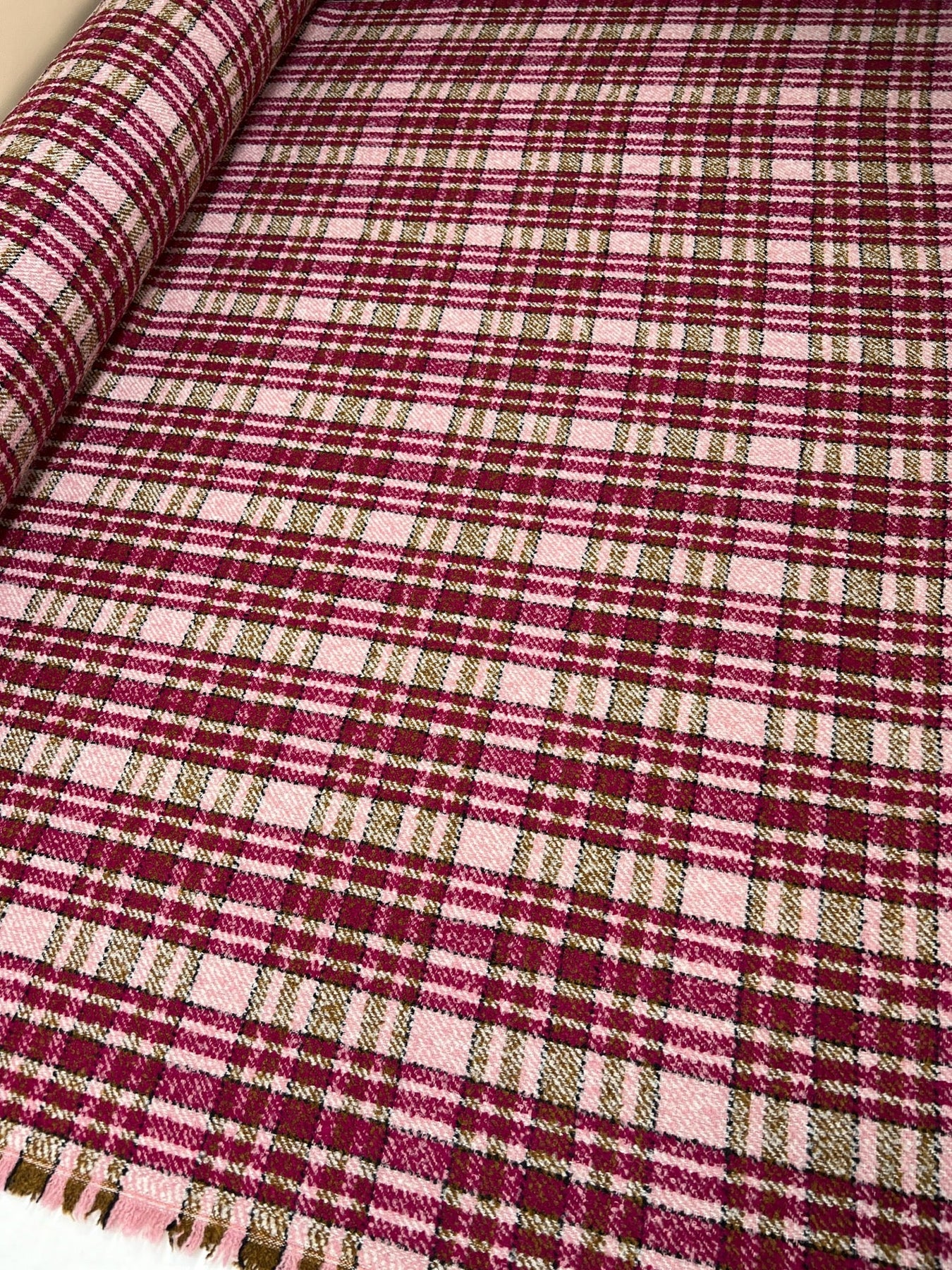 This Italian bouclé suiting fabric in beige and pink plaid delivers texture, structure, and timeless elegance. Ideal for structured skirts, coats, and tailored suits, it is perfect for designers creating modern, fashion-forward pieces with a classic edge.