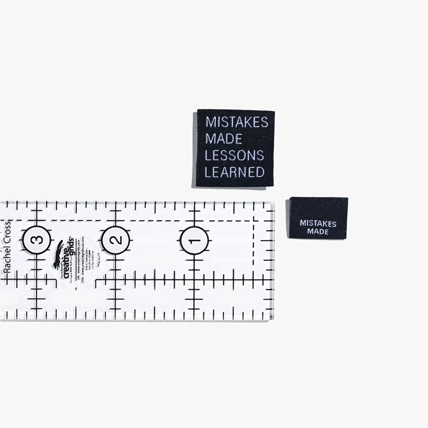 Motivational woven labels reading 'Mistakes Made Lessons Learned' in side seam and end fold styles by Kylie and the Machine - for proud skill-building sewists