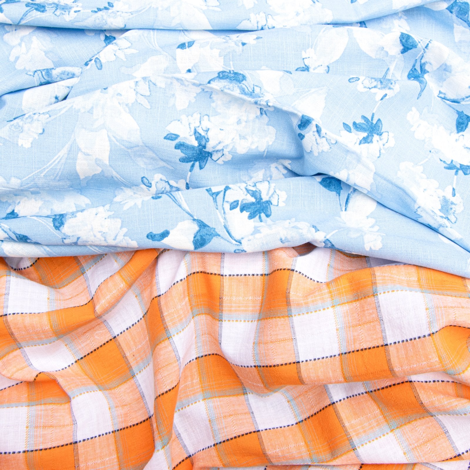This orange and white plaid shirting cotton delivers exceptional quality with its yarn-dyed colors and generous width. The sophisticated yet fun color combination works year-round, making it perfect for both casual and polished creations.