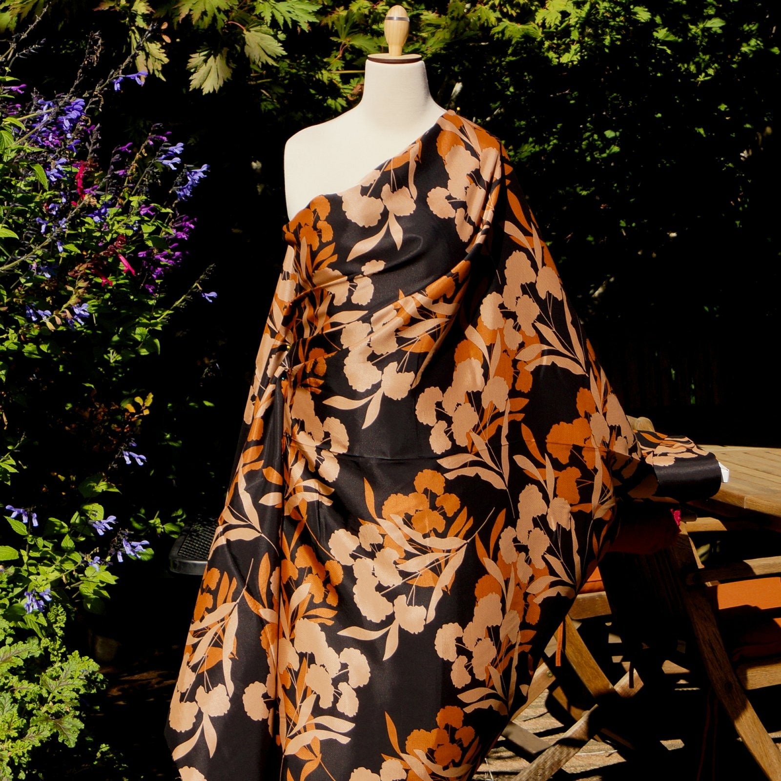 The Sunset Floral Rayon Viscose Satin Twill is a high-quality, limited-edition fabric perfect for creating elegant holiday dresses and statement pieces. Its soft hand, satin sheen, and vibrant floral design make it a must-have for any sewing enthusiast seeking unique, luxurious fabrics.