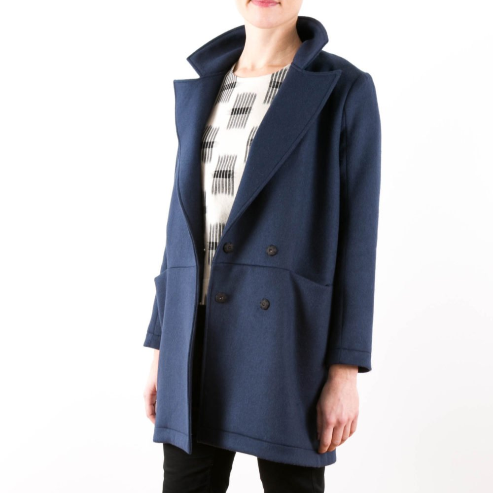 Grainline Studio Yates Coat sewing pattern with oversized lapel, snap closure, inseam pockets, and mid-thigh modern coat design