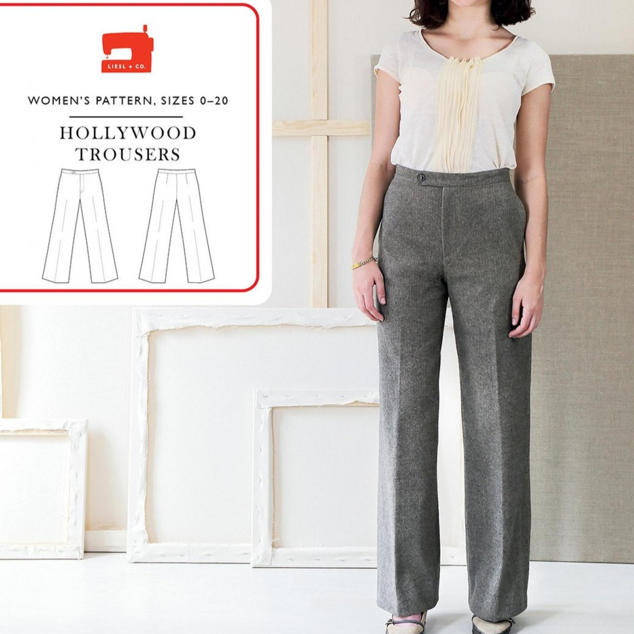 The Hollywood Trousers by Liesl & Co. are classic, high-rise wide-leg trousers with professional tailoring details including a zipper fly, back darts, and optional pockets. Designed for sizes 0–20, this pattern is perfect for lightweight wools, twills, corduroy, and drapey fabrics for a polished, sophisticated look.