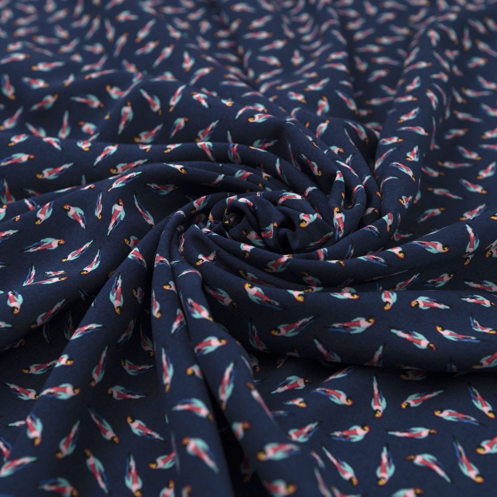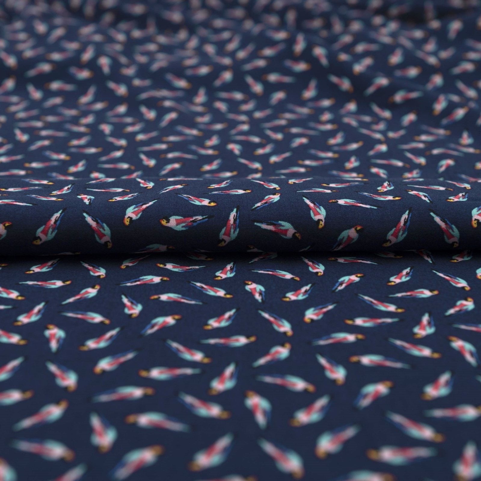 Viscose Challis fabric in navy blue with whimsical parrot print for lightweight summer dresses, skirts, and loungewear