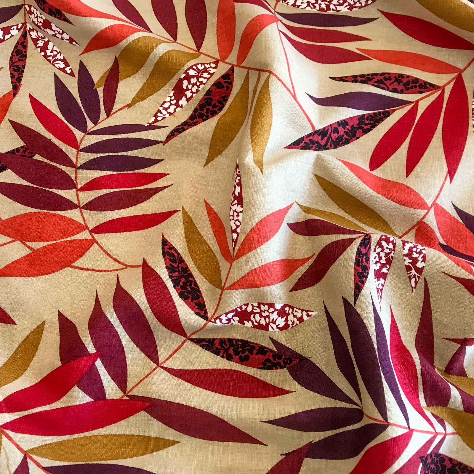 The Linen – Red and Bordeaux Leaf captures the beauty of fall with a warm, nature-inspired leaf print. Set against a natural background, the design features rich burgundy, orange, maple, and purple tones accented with delicate fronds. This exceptional quality linen offers a soft hand and graceful drape, making it perfect for tops, dresses, skirts, or loose-fitting pants. Ideal for year-round wear, this fabric brings the breathable comfort of linen with a seasonal, artistic flair. As a deadstock fashion house fabric, availability is limited—making it a rare and exclusive addition to your sewing collection.