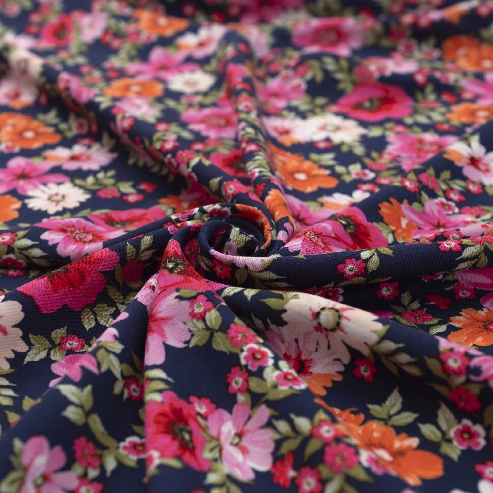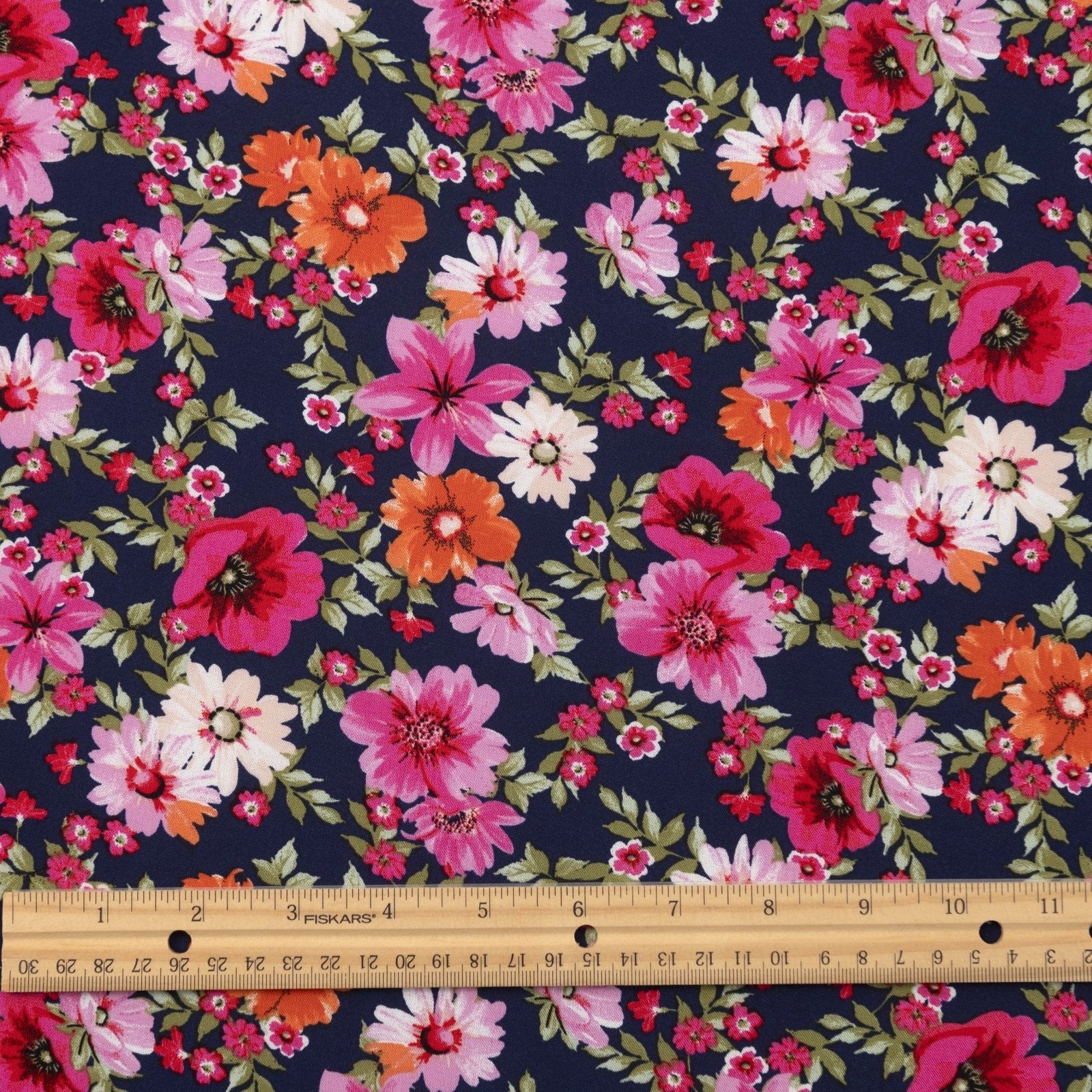 Rayon Challis - Navy Floral Oasis is a medium-weight woven fabric that combines a rich navy base with bright floral accents. Its soft drape and smooth texture make it perfect for creating unique, stylish garments. Limited deadstock ensures exclusivity, making every project truly one-of-a-kind.