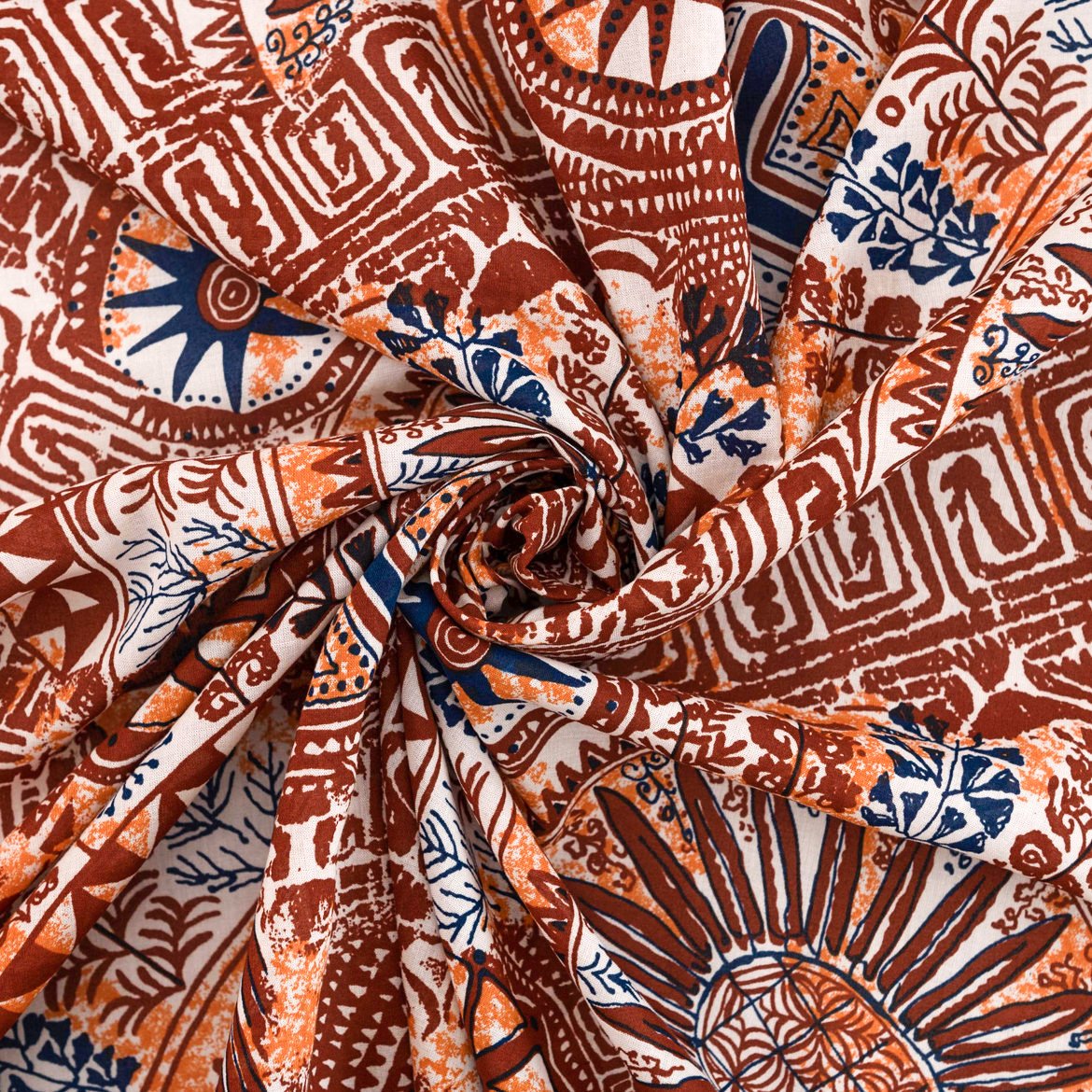 Cotton Lawn – Spice Sunset Batik is a lightweight, breathable 100% cotton fabric in warm earthy tones with navy accents. Perfect for blouses, dresses, camp shirts, or layered outfits, it combines bohemian style with easy-care sewing quality in a limited deadstock offering.