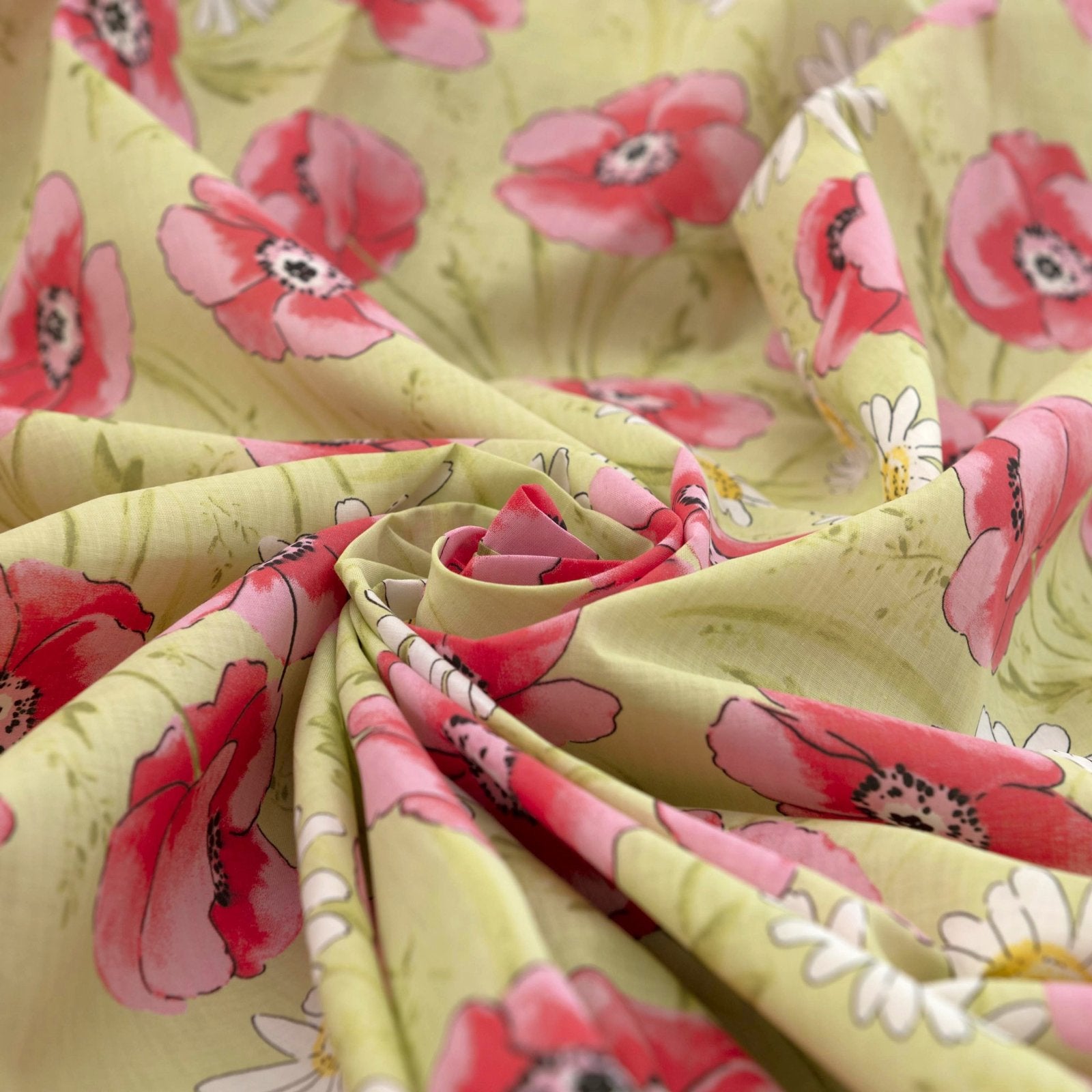 Cotton Lawn – Spring Blossom is a lightweight, breathable 100% cotton fabric featuring cheerful pansies and daisies on a fresh green background. Perfect for blouses, dresses, skirts, and camp shirts, it brings vibrant, playful floral charm to your sewing projects.