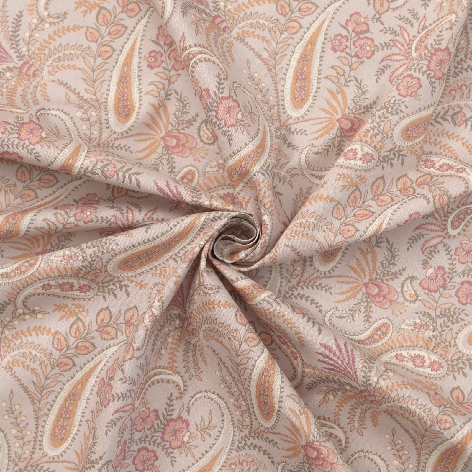 Wrap yourself in delicate elegance with our Cotton Stretch Poplin - "Soft Peach Paisley", a luxurious fabric that combines comfort and style. This Oeko-Tex certified textile features a 97% cotton/3% spandex blend, offering the perfect marriage of breathability and gentle stretch for all-day comfort. The 58-inch wide fabric showcases a captivating paisley motif in soft peach tones that create a romantic, flowing effect. Perfect for flattering sundresses, breezy blouses, and stylish skirts, this lightweight poplin drapes beautifully while maintaining enough structure for polished silhouettes. The subtle stretch ensures ease of movement, making every garment as comfortable as it is beautiful. As a premium deadstock fabric, this textile offers designer quality at accessible prices - but with limited yardage available, this dreamy paisley won't last long!