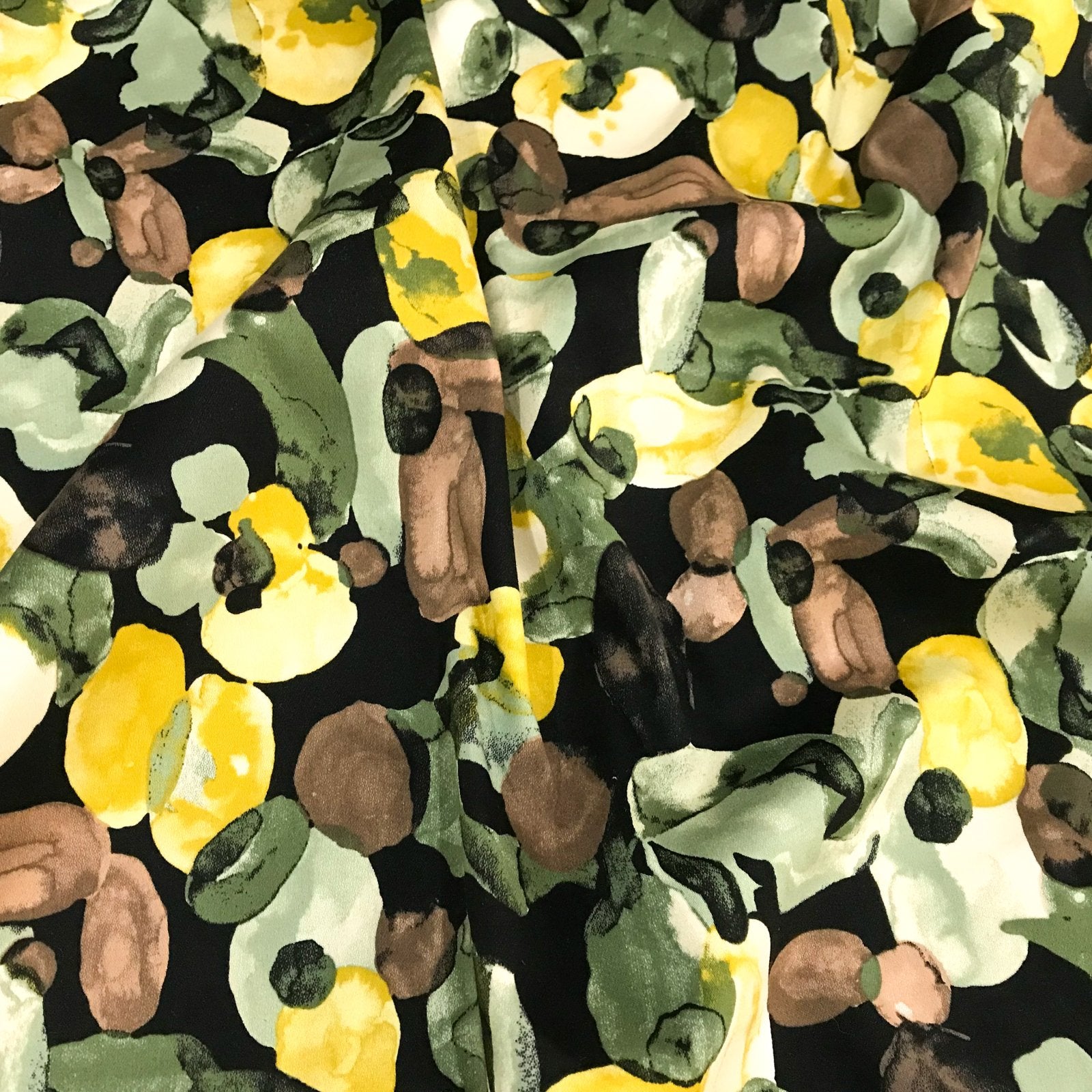 Cotton Stretch Sateen – Green Dollops is a light-to-midweight, slightly stretchy cotton fabric featuring autumnal green dollops on a black background. Perfect for jackets, skirts, culottes, and shirts, this OEKO-TEX certified fabric combines comfort, style, and versatility for seasonal wardrobe staples.