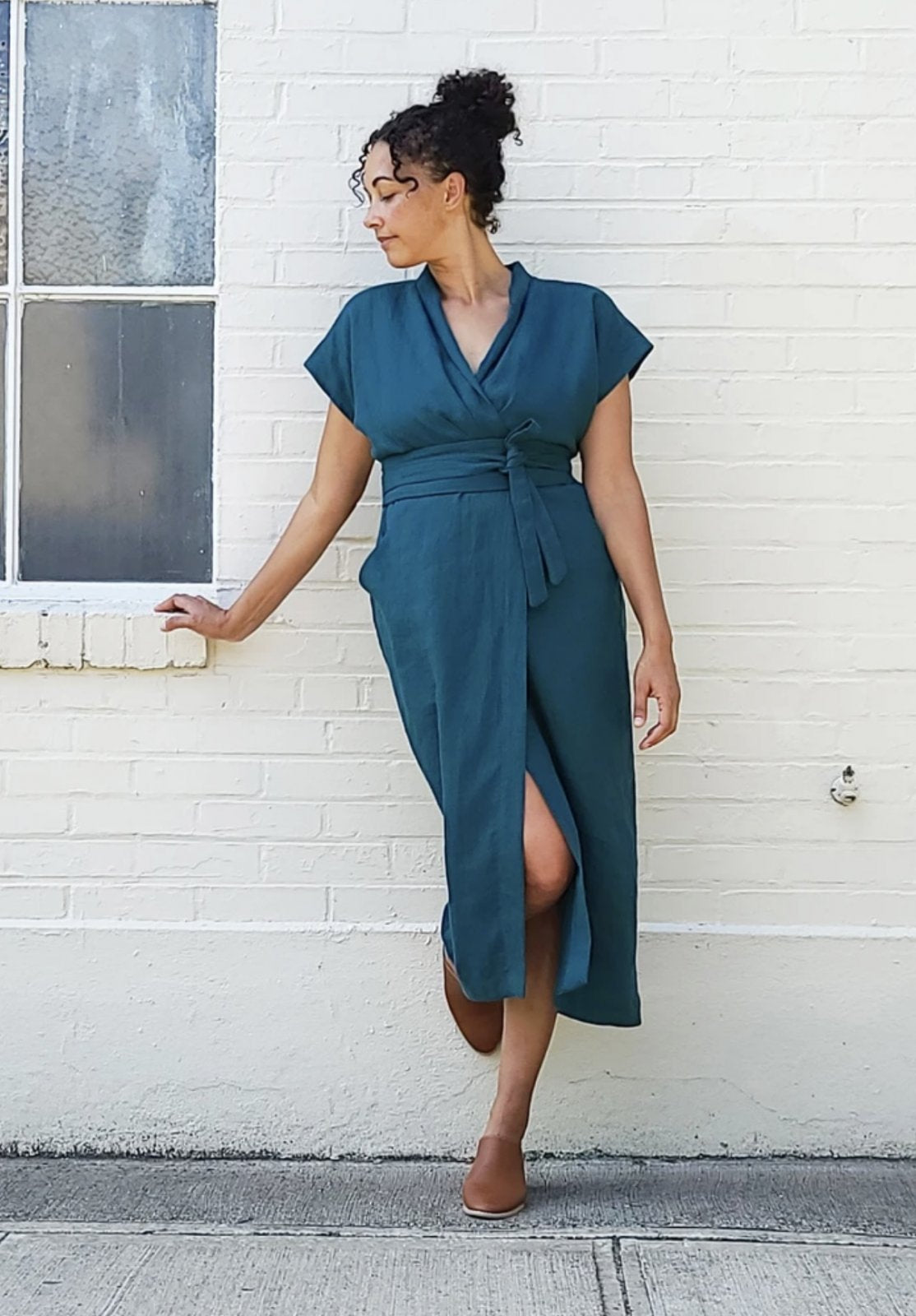 The Sew House Seven - Wildwood Wrap Dress is an elegant shawl collar wrap dress with a detached obi-inspired belt. Designed with waist and shoulder pleats, it creates a flattering drape around the neckline and a slim skirt with deep pockets and a wide, faced hem. Choose from two sleeve options—dolman rolled-up sleeves or short cut-on sleeves—and two hem lengths: below the knee or midi-length. Perfect for a variety of drapey fabrics, this versatile dress accommodates both standard (00-22) and curvy (16-34) sizes.