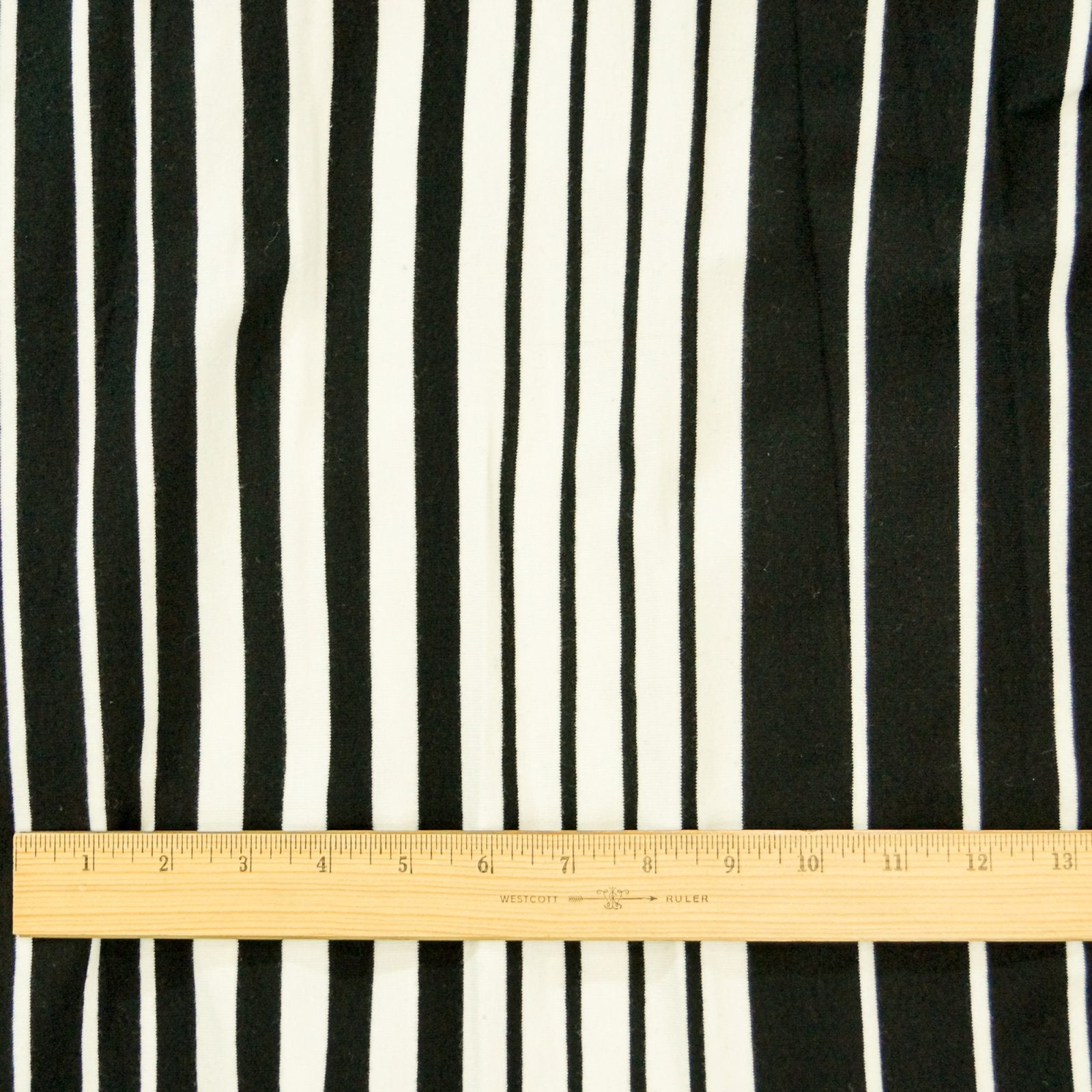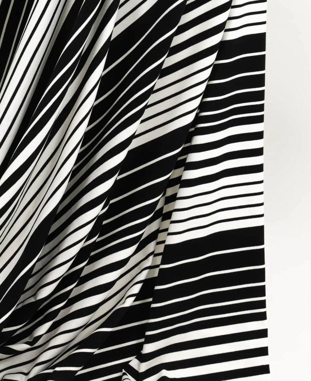 This Black & Warm White Variegated Stripe Knit is a sewing essential—offering classic stripes, superior stretch, and professional-quality drape in one deadstock fabric. Perfect for tees, cardigans, and cuffs, its 66-inch width and ribbed versatility make it a must-have for any project. Limited stock—don’t miss out!