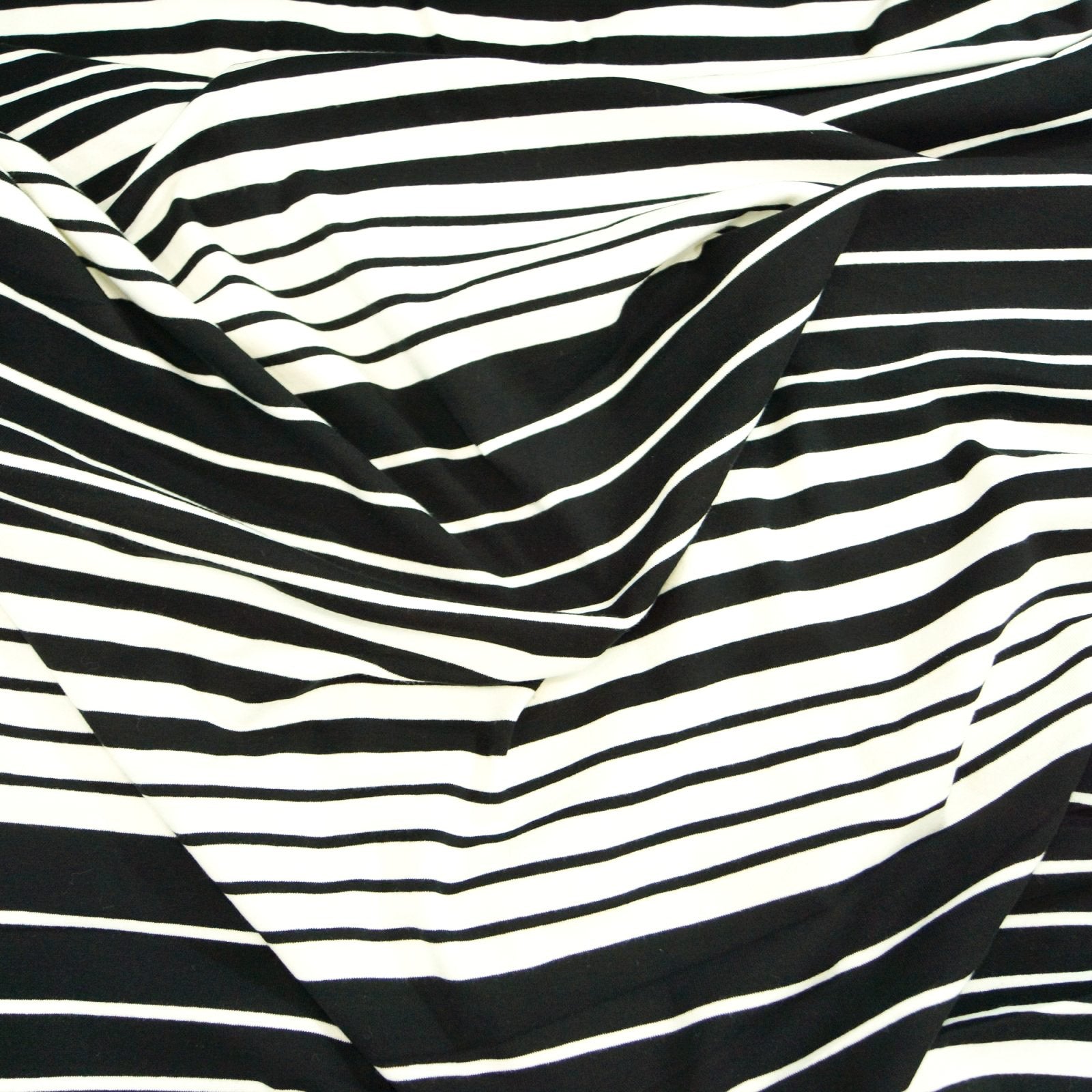 Fall in love with this Black and Warm White Variegated Stripe Cotton Knit—a 90% cotton, 10% spandex blend that offers the perfect balance of softness, stretch, and style. The 66-inch width provides ample fabric for tees, cardigans, cuffs, and more, while the subtle 1x1 rib knit texture gives it a flat-knit appearance with the versatility of ribbing trim. The warm cream white and deep black stripes create a timeless yet eye-catching design, and the excellent stretch recovery ensures a flattering, comfortable fit. Yarn-dyed for consistent color on both sides, this medium-weight knit is ideal for layering pieces without being too bulky. As a deadstock find, this high-quality striped knit won’t last long—grab yours before it’s gone!