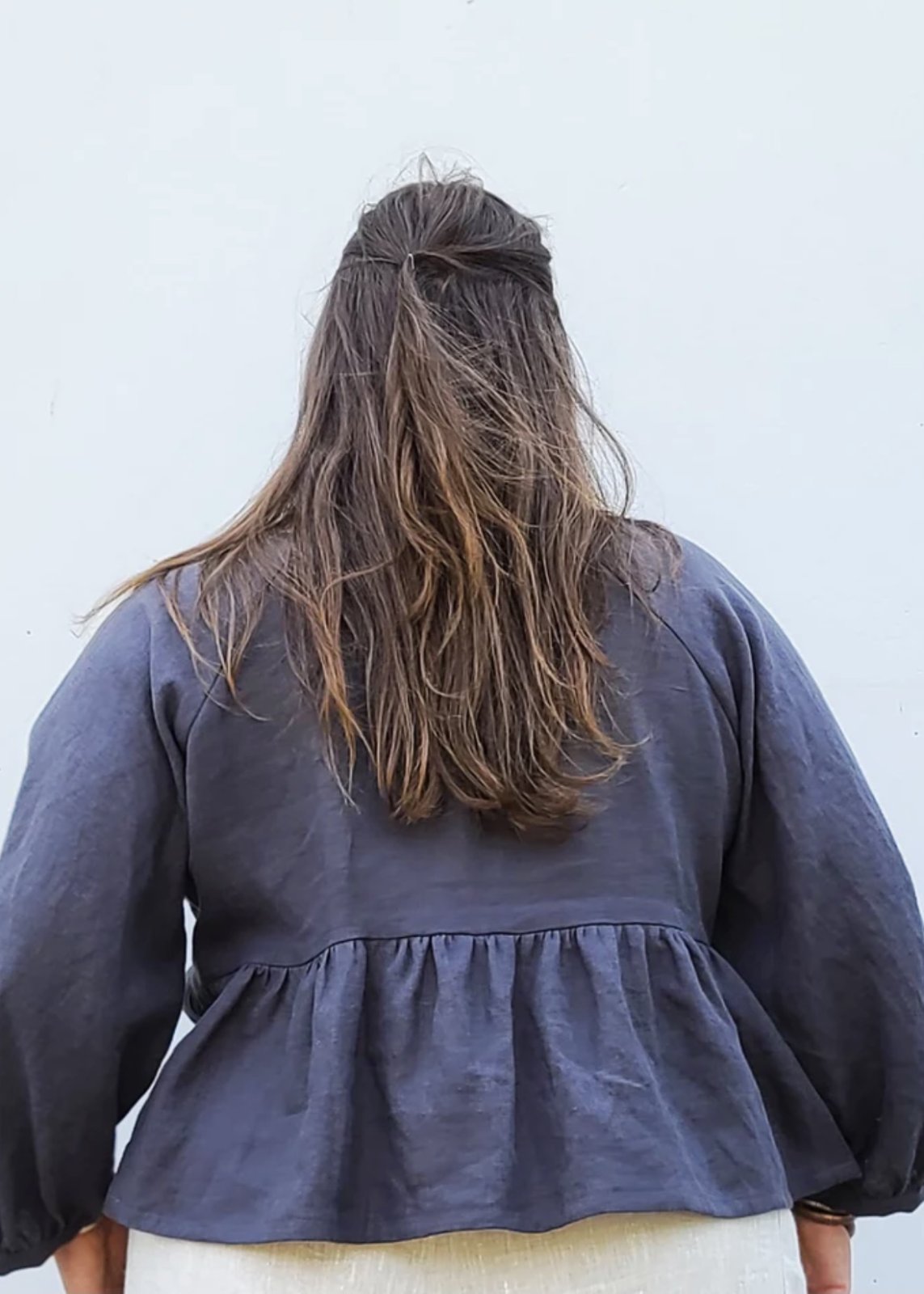 Ideal for lightweight woven fabrics with beautiful drape, such as linen/viscose blends, rayon challis, sandwashed silk, linen, or cotton lawn, the Romey pattern includes curvy sizes 16–34 (bust 47”–65”).