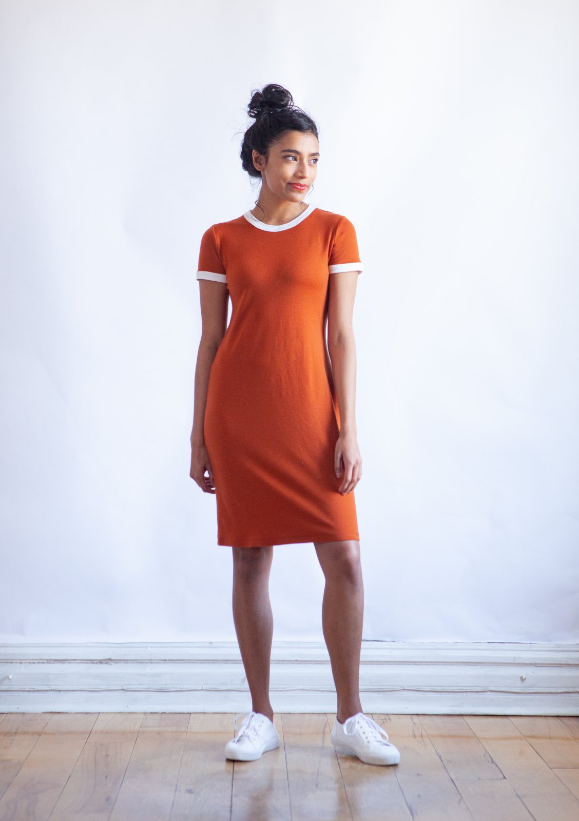 True Bias Rio Ringer T-Shirt & Dress sewing pattern with retro ribbed neckline and sleeve trim in T-shirt and dress versions