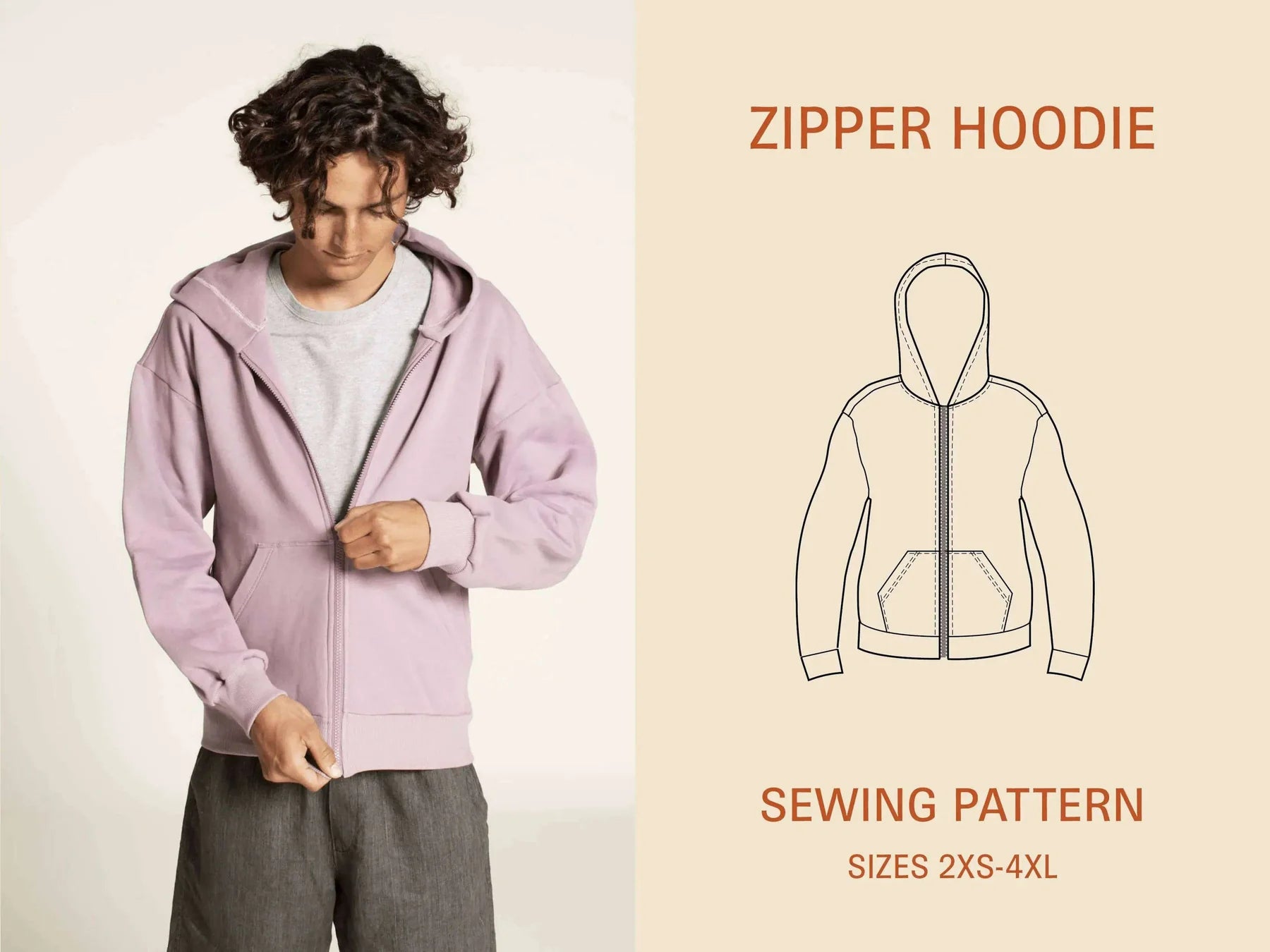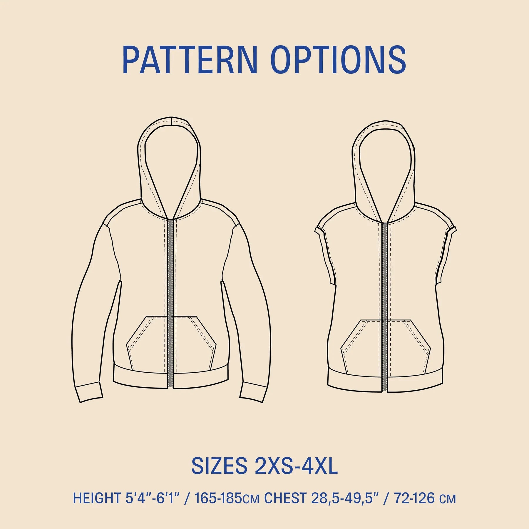 Featuring a full-length front zipper, a generous hood, and a relaxed fit, this design is made for everyday comfort. Set-in sleeves create a clean, structured shape, while ribbed cuffs and hem provide a secure finish. The classic kangaroo pocket is divided by the zipper for function and symmetry, and the option for a sleeveless version offers additional versatility. Garment length is drafted to correspond with standard zipper lengths for a polished, professional result.