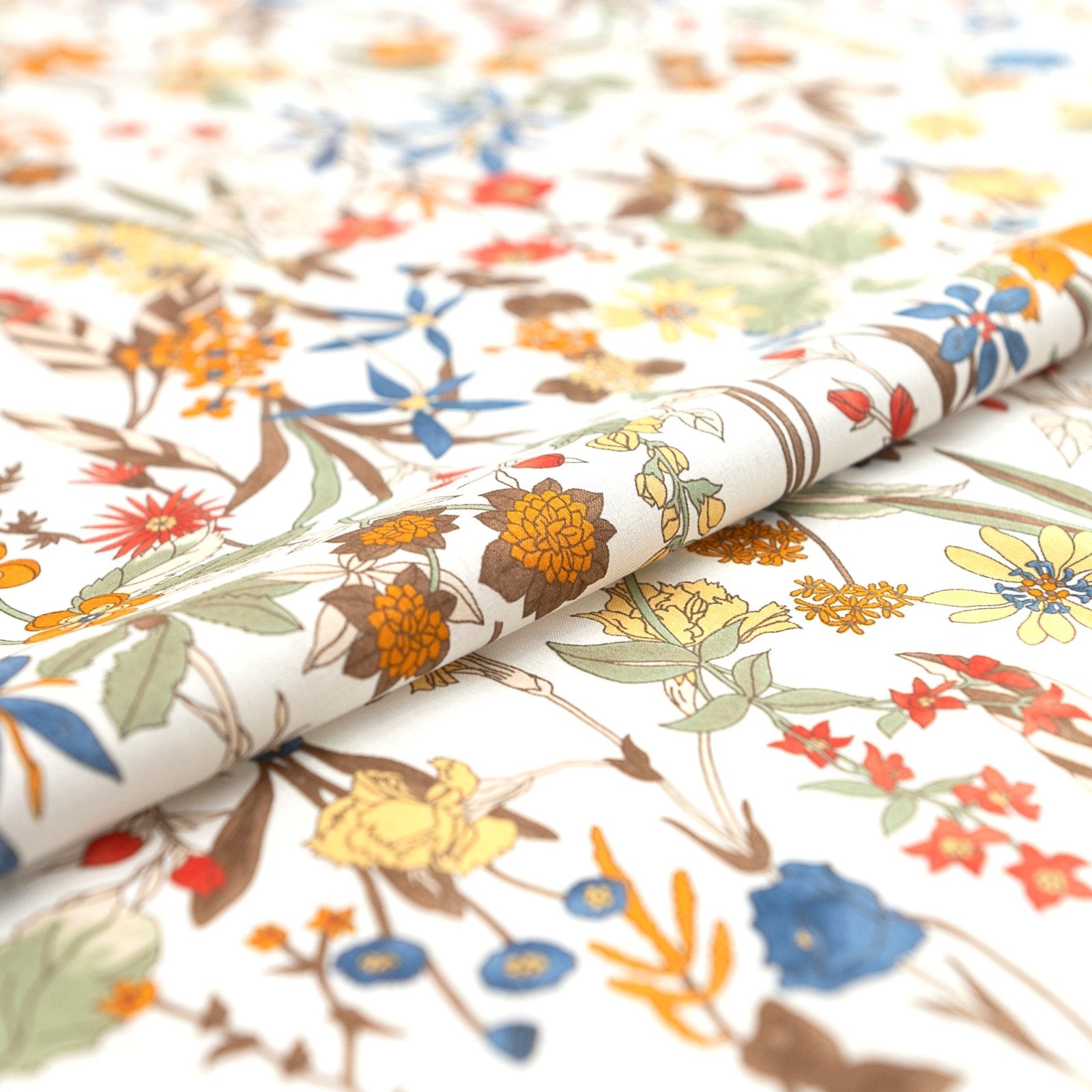 Add elegance and artistry to your sewing projects with Japanese Cotton Poplin - Lily Spray in Cream by Hokkoh. Crafted from 100% premium Japanese cotton, this fabric features a soft cream base highlighted with vibrant lily sprays in rich, lively colors, bringing nature-inspired beauty to your wardrobe. Lightweight yet structured at 4.3 oz per square yard and 43 inches wide, it offers a smooth hand, breathable comfort, and graceful drape. Perfect for blouses, dresses, skirts, and statement shirts, this fabric combines timeless sophistication with fresh, artistic charm.
